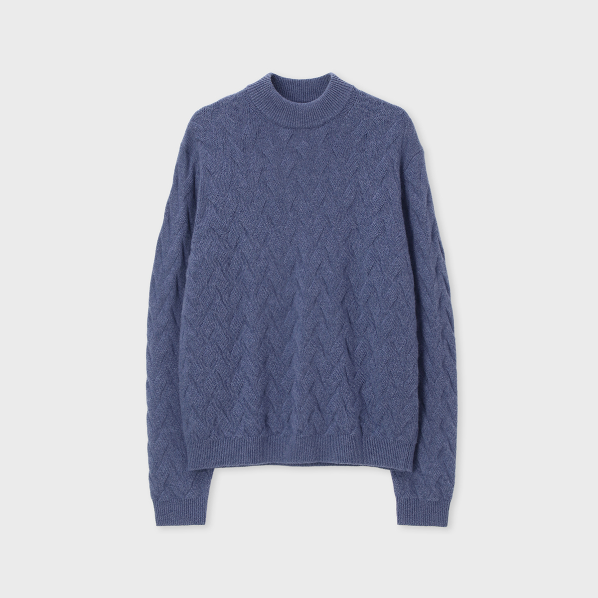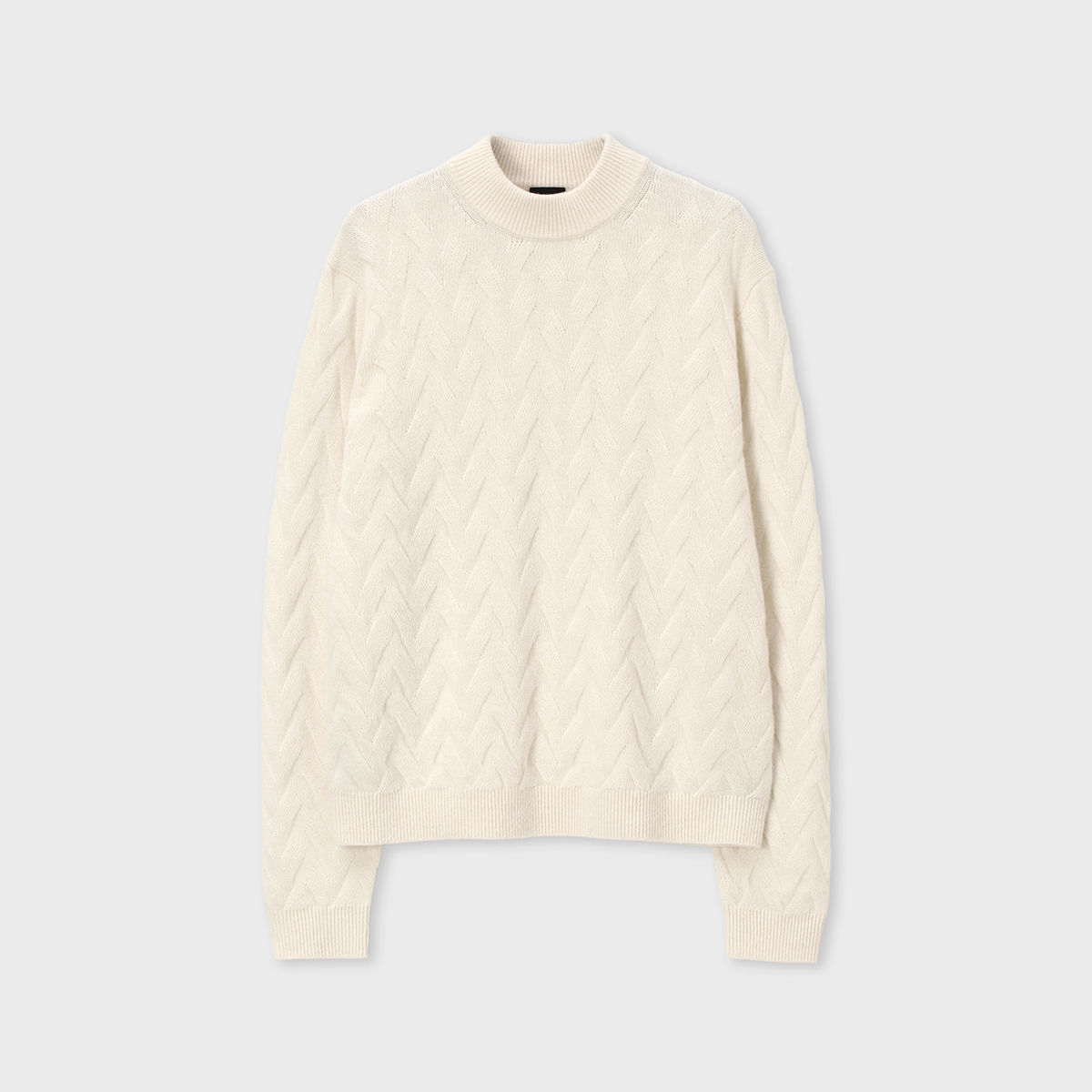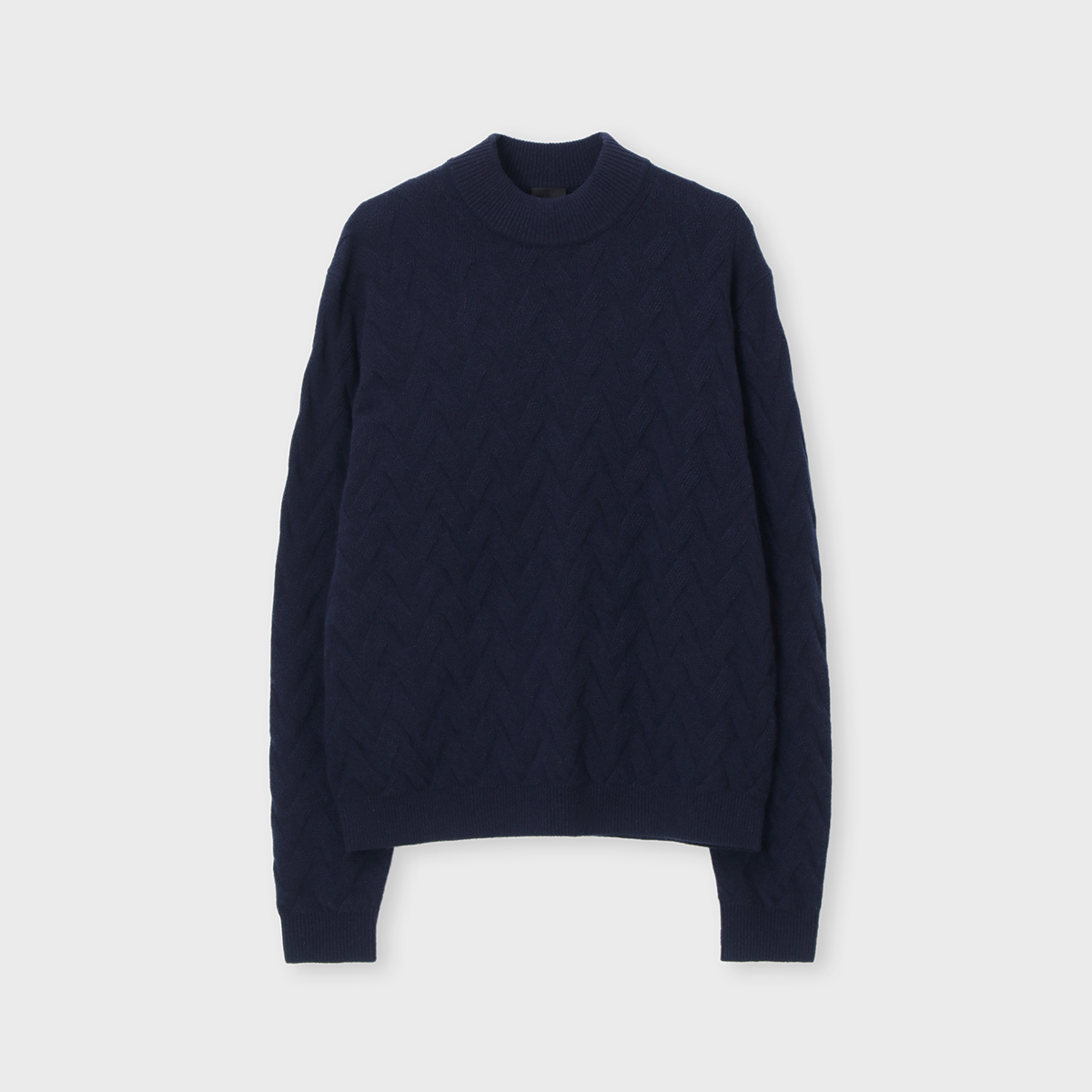 ウルトラファインメリノウール×カシミヤのなめらかなハイネックニット。ジグザグのシェブロン柄と程よいボリューム感で、アウターやコートのインに最適。寒い冬を温めてくれる、ホリデーギフトにふさわしい一枚です。