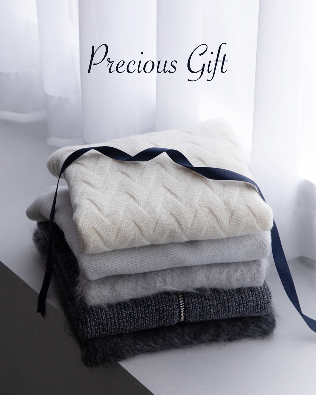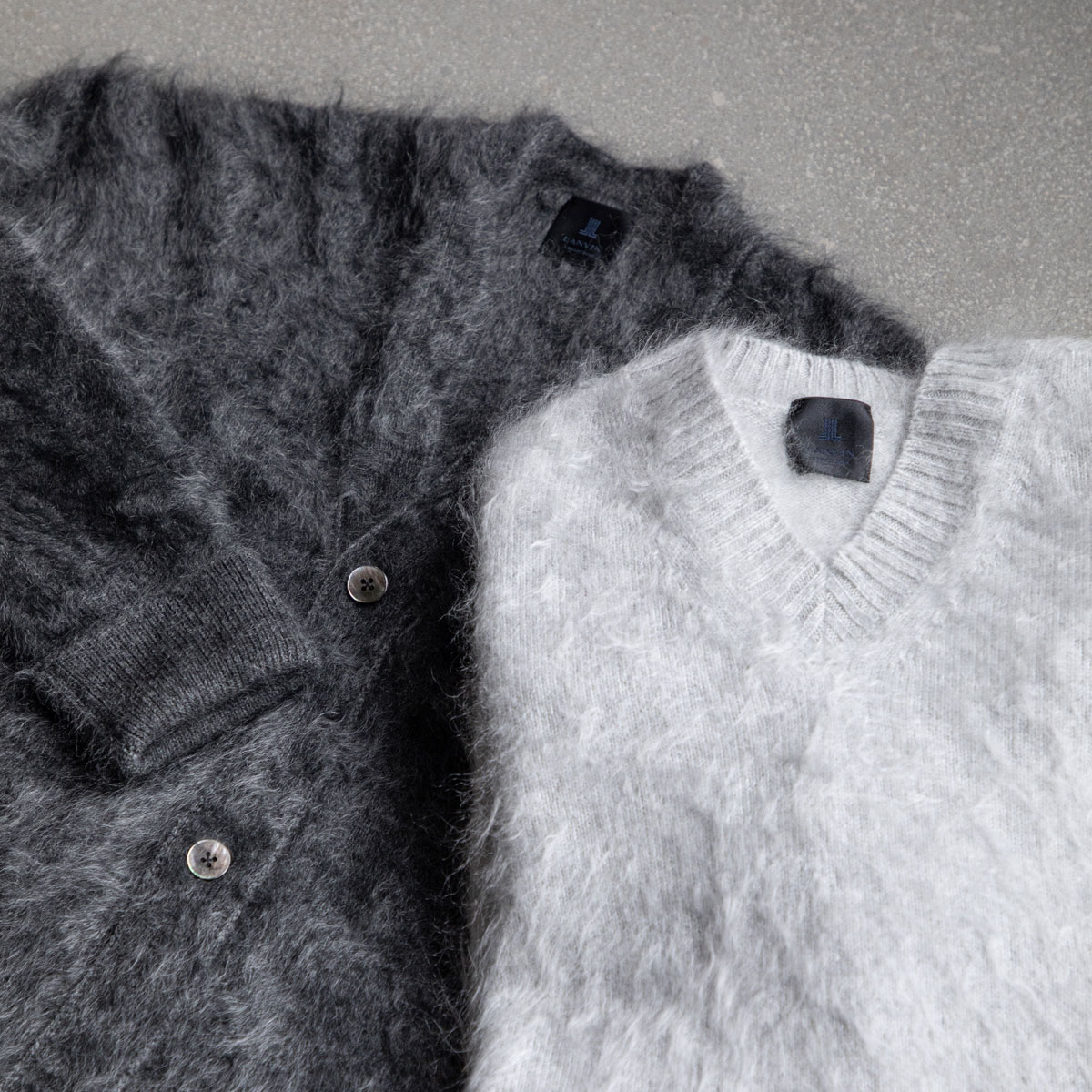 上質なホワイトカシミヤを使用したクルーネックニットやフルジップカーディガン、さらにはジップアップベストを展開。柔らかく滑らかな肌触りで、配色ラインやダブルJL刺繍がさりげないアクセントに。防寒性と上品さを兼ね備え、時代に左右されない永く愛用できる一枚です。
