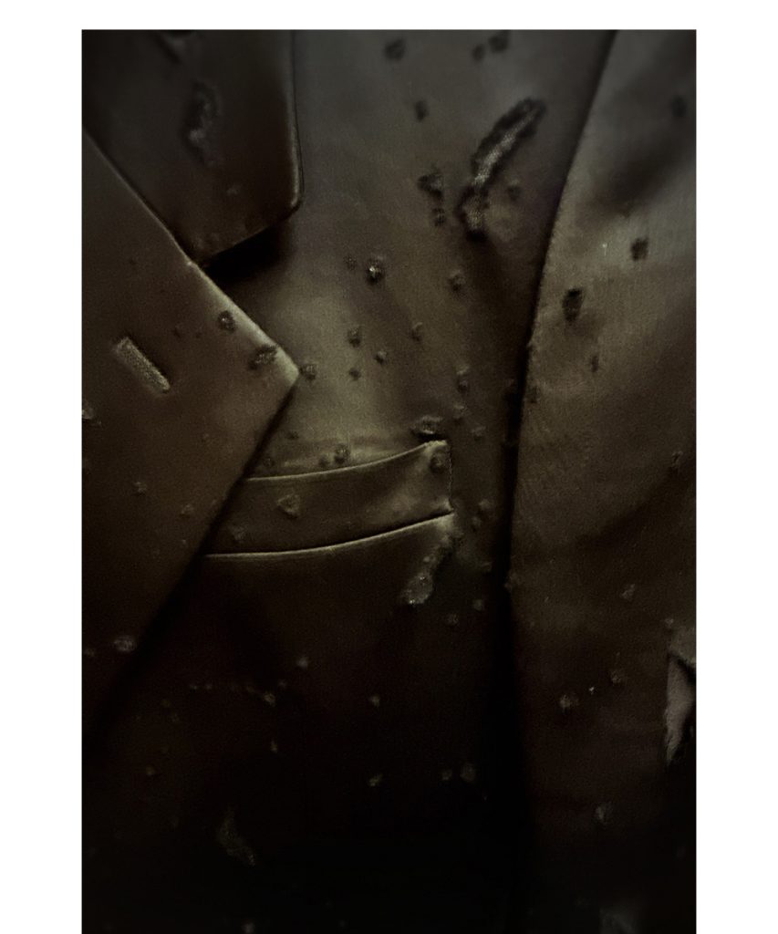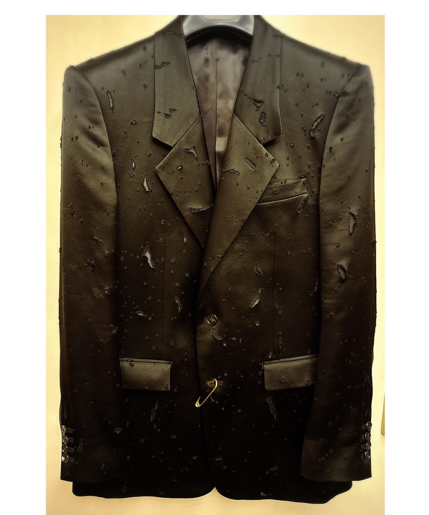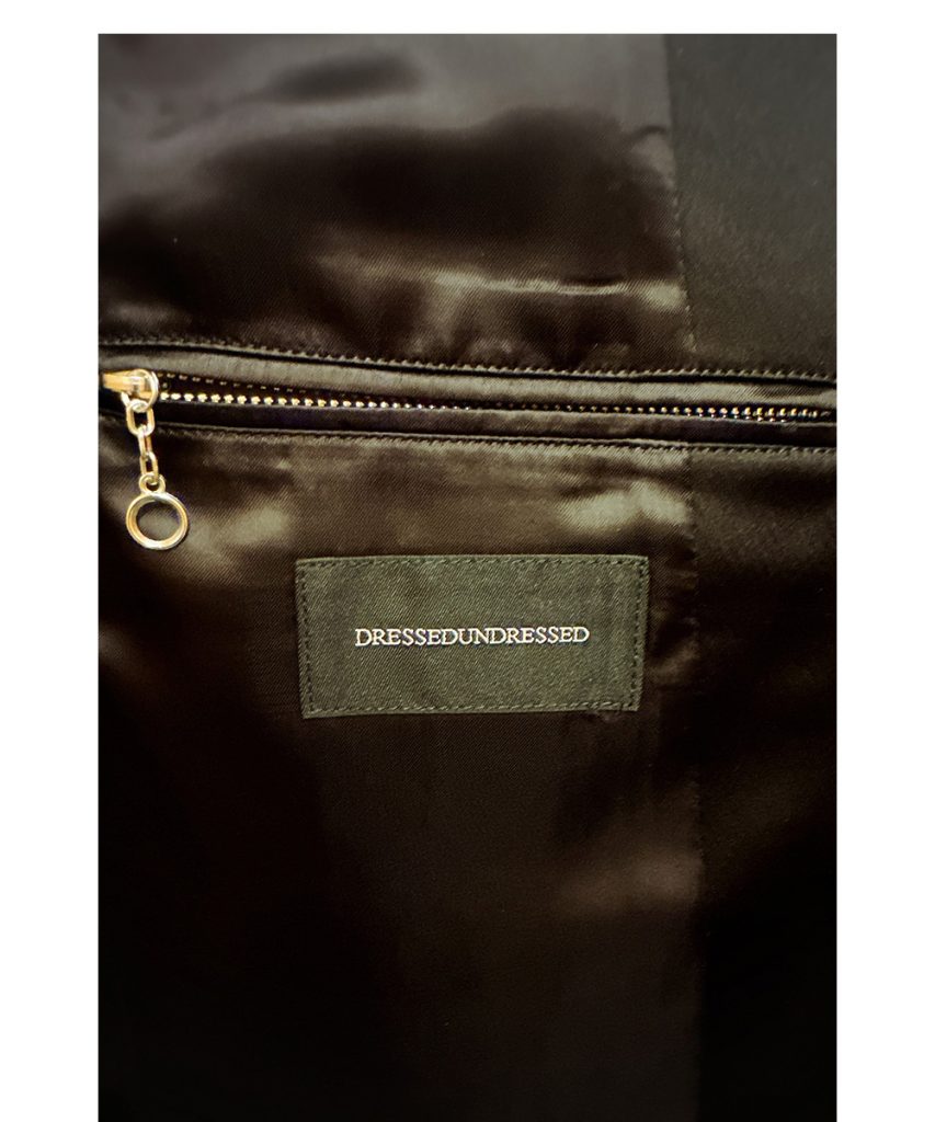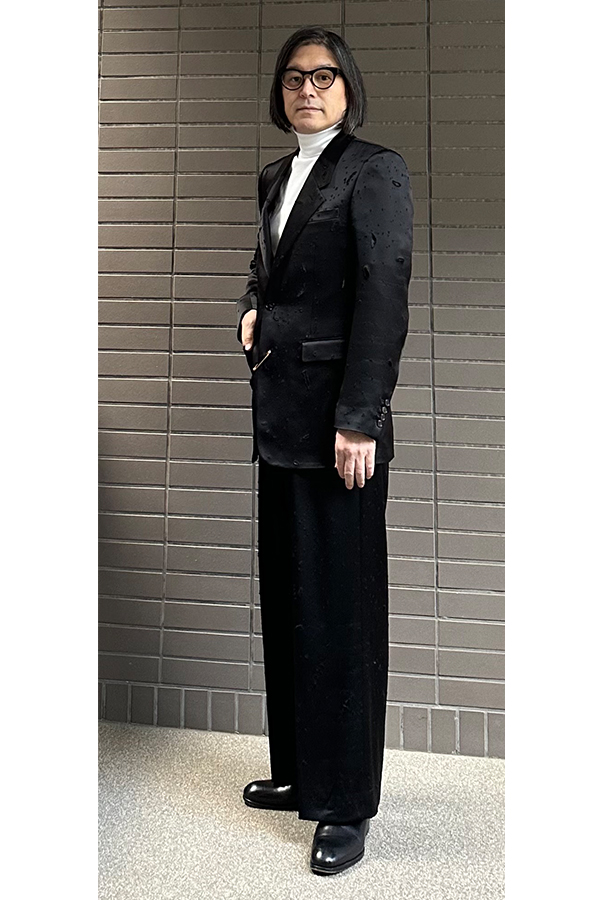 この『DRESSEDUNDRESSED』というブランド、スタイリストをしているのに僕はまったく存在を知らなかった。長いこと海外ブランドにばかり目を向けていたので、いわゆるドメスティックブランドに関してはあまり興味を持たないままこれまできてしまった。そしてコロナ以降は海外のコレクションにも行かなくなり、海外出張自体、なるべく避けるようにもなっていた。そんな僕に昨年の夏、インスタにDMが届いた。デザイナーの北澤武志さんからの、気持ちのこもった展示会へのお誘いだった。インスタで作品の画像などを見ると、なんか面白そうな感じ。90年代のヘルムート・ラングやジャン・コロナを彷彿とさせる服が、モノクロで撮られて並んでいた。「ほ〜。行ってみようかな」。ちょうど丸1日オフの日があったので、中目黒の展示会場に行ってみた。そこで見たのは、非常にエレガントなフォルムなのに全体のあちこちにハサミで開けたような穴が散らばっているジャケットやパンツ。これまでも黒のセットアップは星の数ほど買って着てきたが、そこに展示されていたセットアップはなんと「穴あき」だった。僕はそこに惹かれた。穴あきの服というとパンクブームの頃の服を思い出すが、このブランドの服は穴あきなのにパンクじゃない。穴あきと言っても、わざとダメージを加えたり裂いたりしてできた穴ではなく、緻密に計算されてあけられた穴なのだ。パンツなんて、穿いているとところどころ肌が穴から透けて見えたりしているので、知らない人に「ちょっとちょっと、パンツに穴、あいてますよ」とか言われそうな感じでもある。でも、多分、言われない。なぜならジャケットは長め、パンツはバギーで素材は光沢感のあるブラック。全体としてはどう見ても「ドレスとして着るためのセットアップ」だからだ。穴から見える僕のふくらはぎの皮膚に気づいて、一瞬「あらら、どっかに引っかけたのか? 教えてあげようかな」と思ったとしても、その後もう1回見て、「いや、違う。あの穴は計算してあけられている」と気づくからだ。最初は「ちょっと展示会を見るだけ見てみよう」という気持ちで向かったわけだが、会場に入って5分後には、「これをドレスアップして着てみたい」となっていたのでありました。