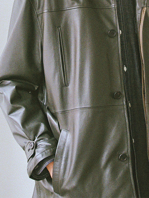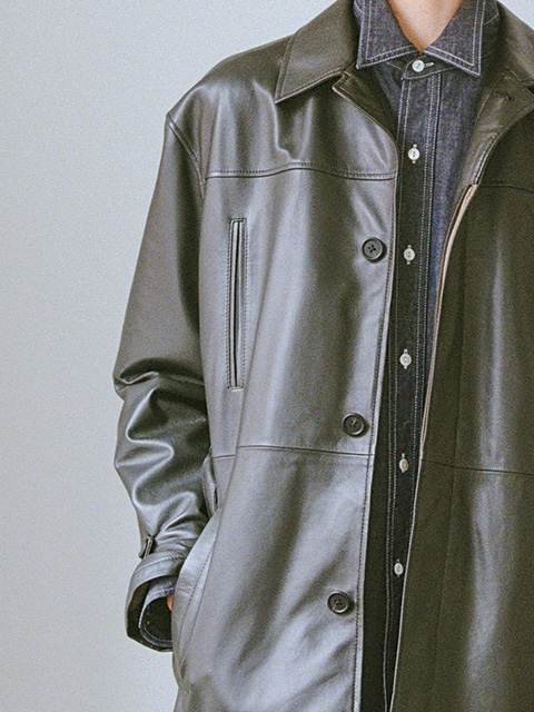 ベルト付きのカーコートをイメージしたショートコート。柔らかなラムナッパレザーを採用することで、軽い着心地を楽しめる1着に仕上げました。一見ブラックレザーに見えますが、深いグリーンに染色することで、元来持つレザーの武骨さを無くして、エレガントに昇華させています。 ラムレザーコート ¥264,000 (tax in)