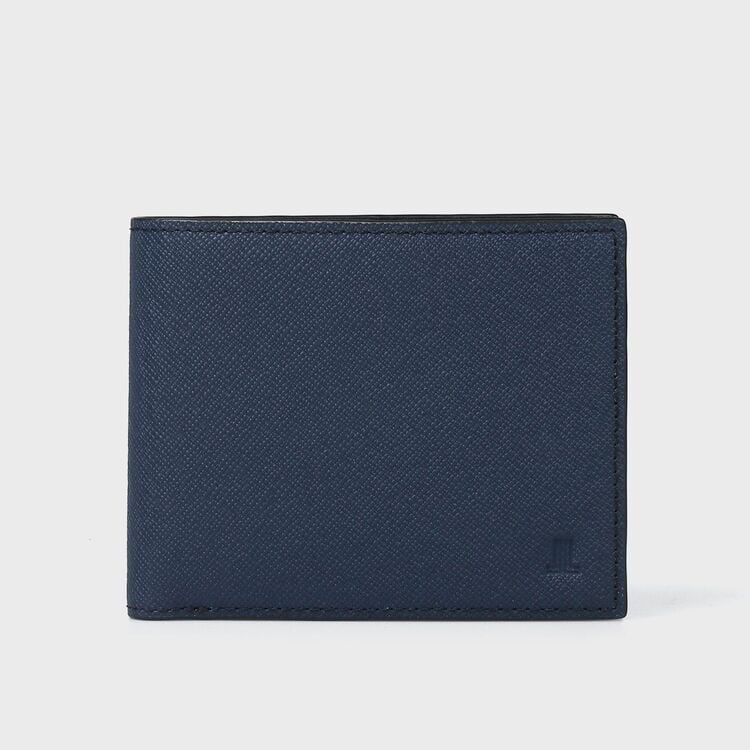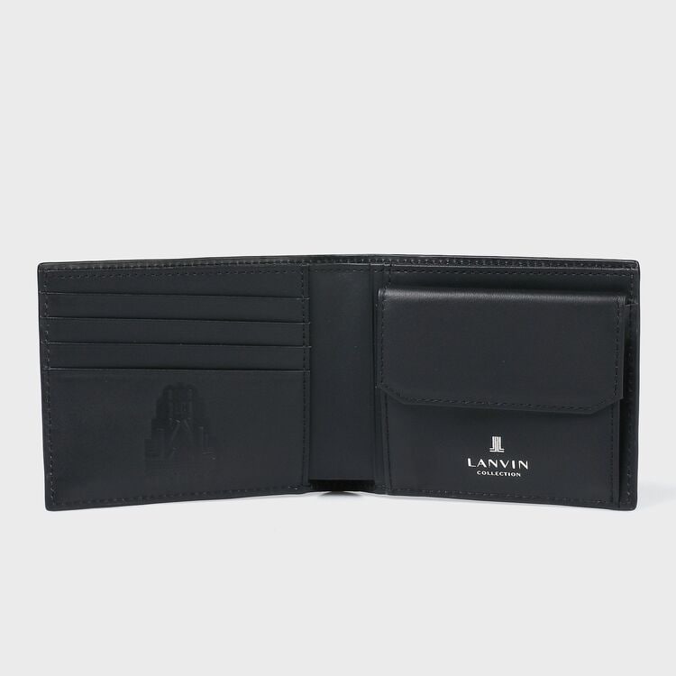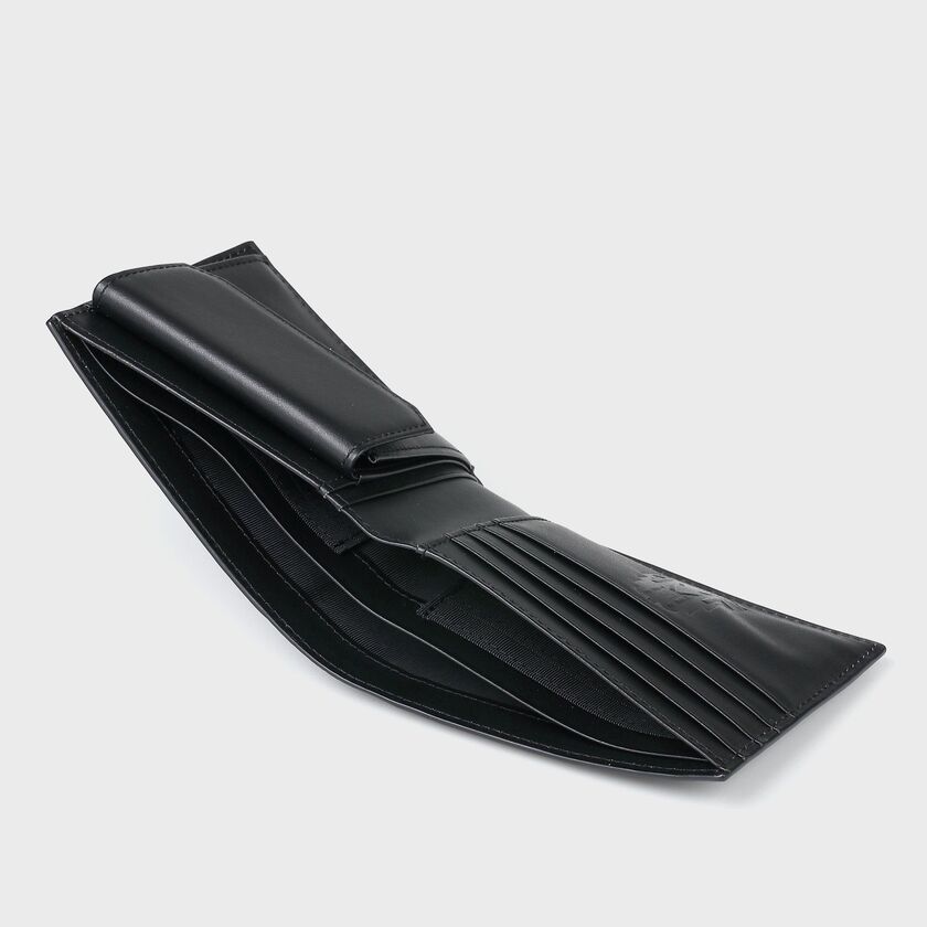型押しのロゴマークがさりげないポイントにになっており、素材の高級感に加え、機能性もかねそなえた小銭入れつきの二つ折り財布です。