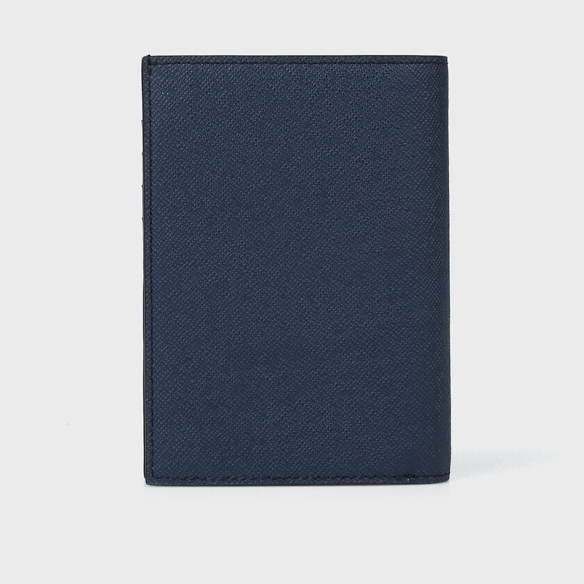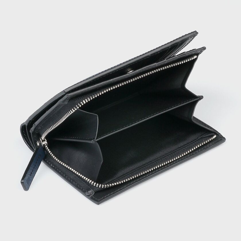 表の素材にはネイビーの繊細な柄のエンボスレザー、内装にブラックのスムースレザーを合わせ、すっきりとスタイリッシュな仕上がりになっています。