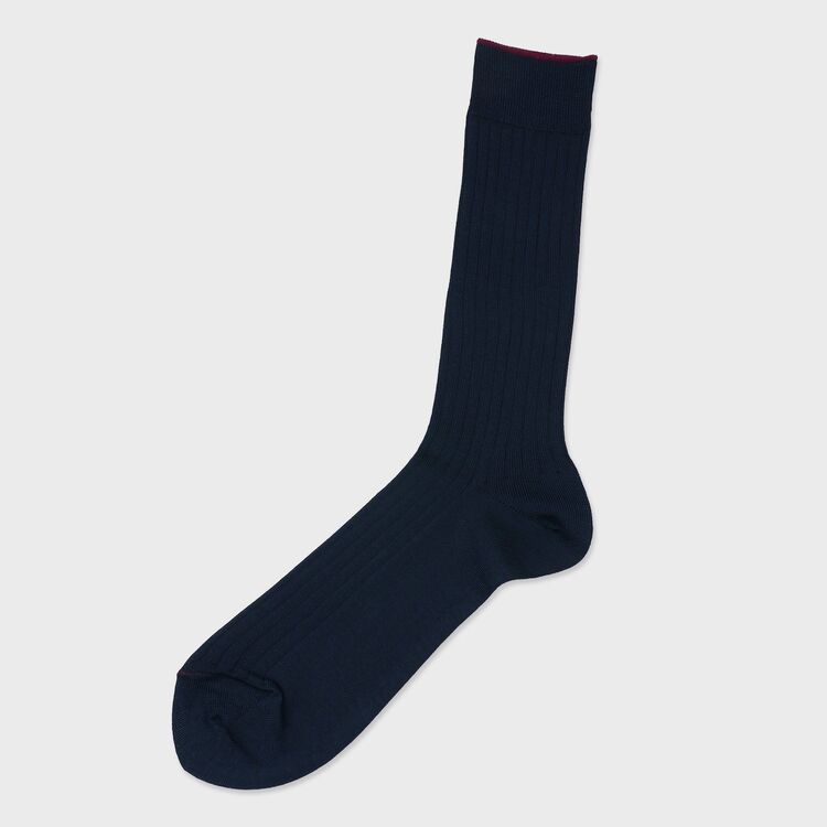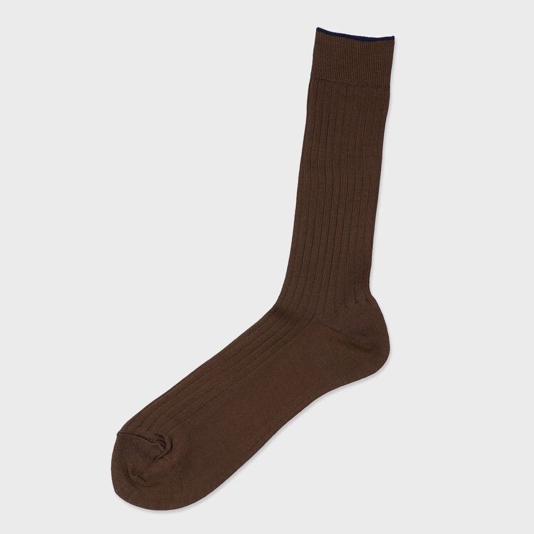 コットンにナイロンを混紡することで、天然素材の吸湿性と、ソックスに不可欠な耐久・伸縮性を両立させました。程よいフィット感を生むリブ編み仕様により、ズレ落ちにくく、かつ締め付けすぎない快適な履き心地です。シルケット加工によるツルッとした肌触りは、靴との摩擦も少なく、一日中ストレスフリーにお過ごしいただけます。
