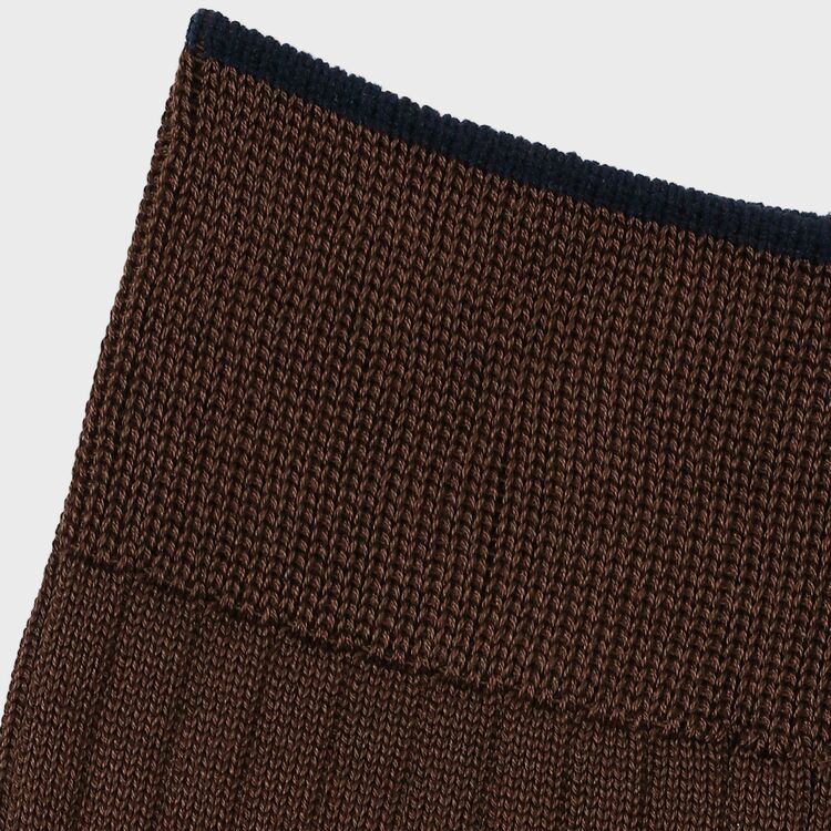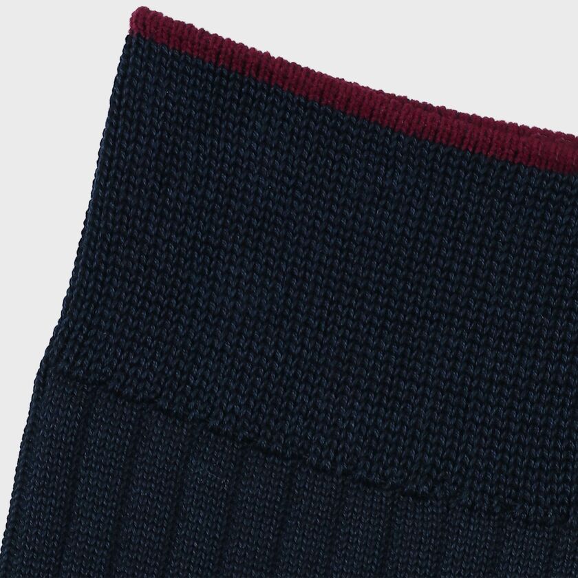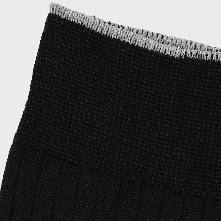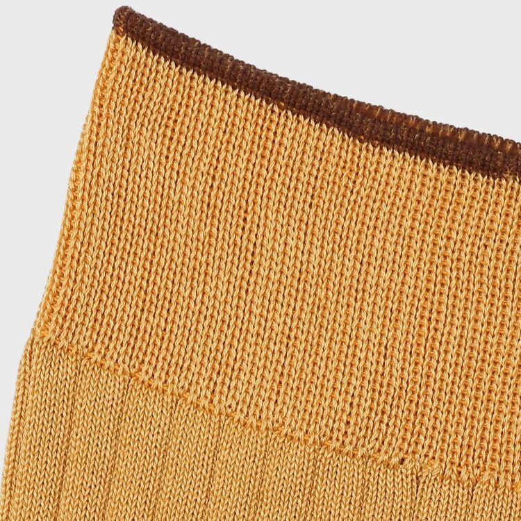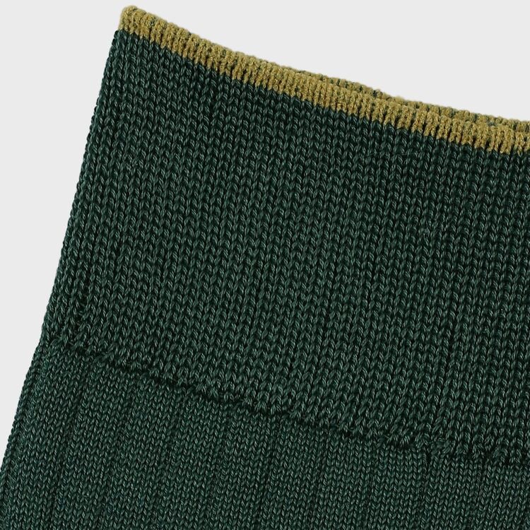 定番として愛される無地のリブソックスをベースに、履き口(トップ)に配色ラインを施した「バイカラーデザイン」が特徴です。靴を履いている時はシンプルな無地に見えますが、足を組んだり靴を脱いだ瞬間に、履き口のアクセントカラーがさりげなく覗く、大人の遊び心を効かせています。カラー展開は、ビジネスの王道である「ネイビー」「ブラック」に加え、今季のコレクションと相性抜群のシーズンカラー「ゴールデンイエロー」「ダークブラウン」「グリーン」を加えた全5色。コーディネートの主役にも脇役にもなれる美しい発色が魅力です。