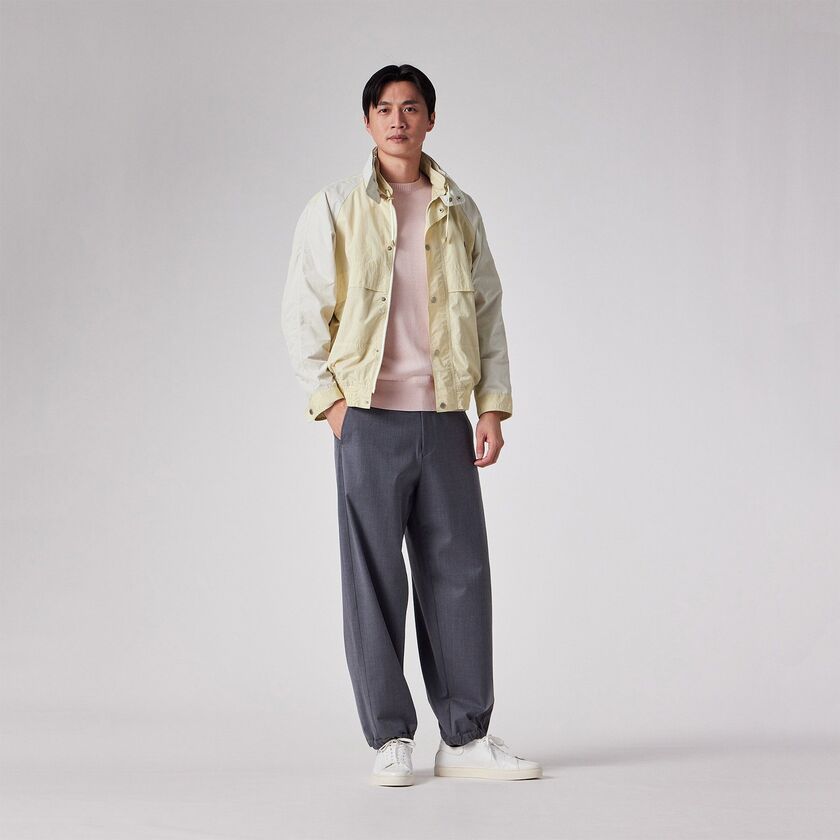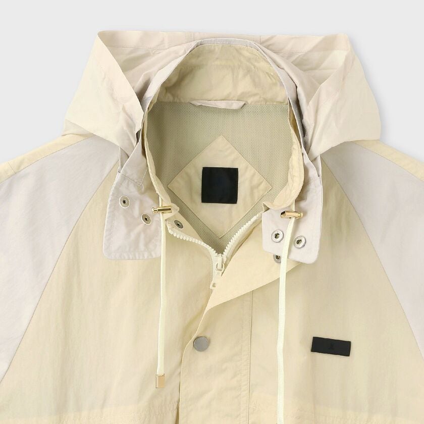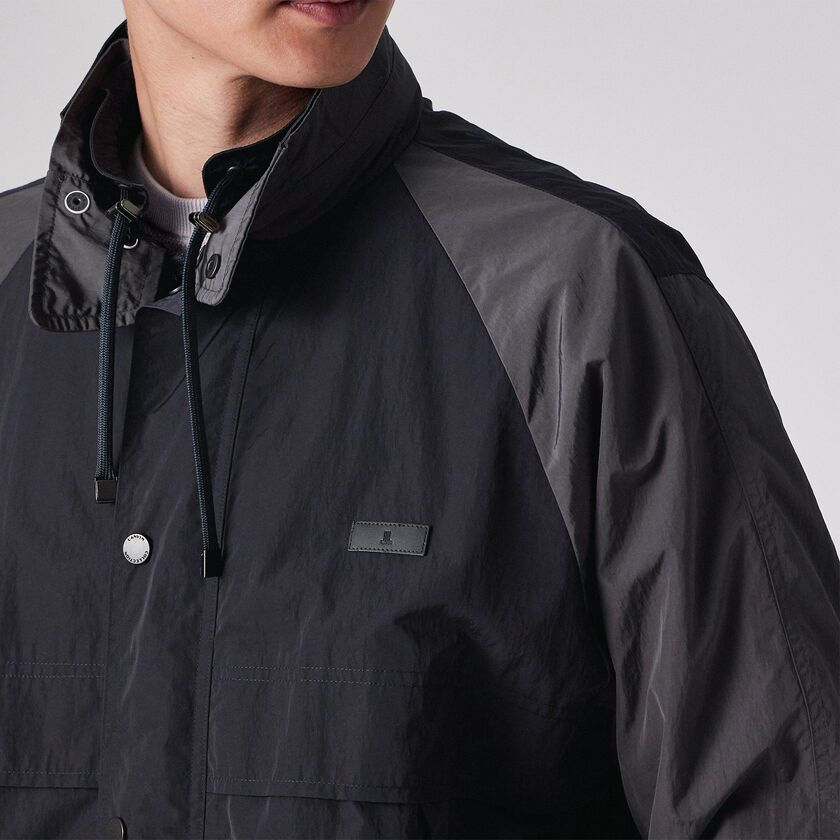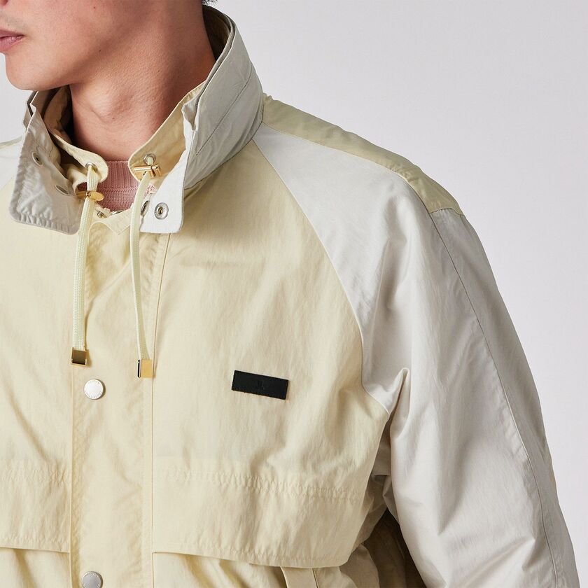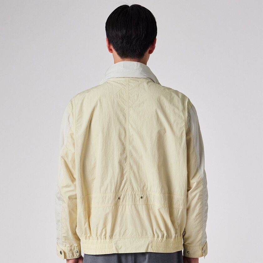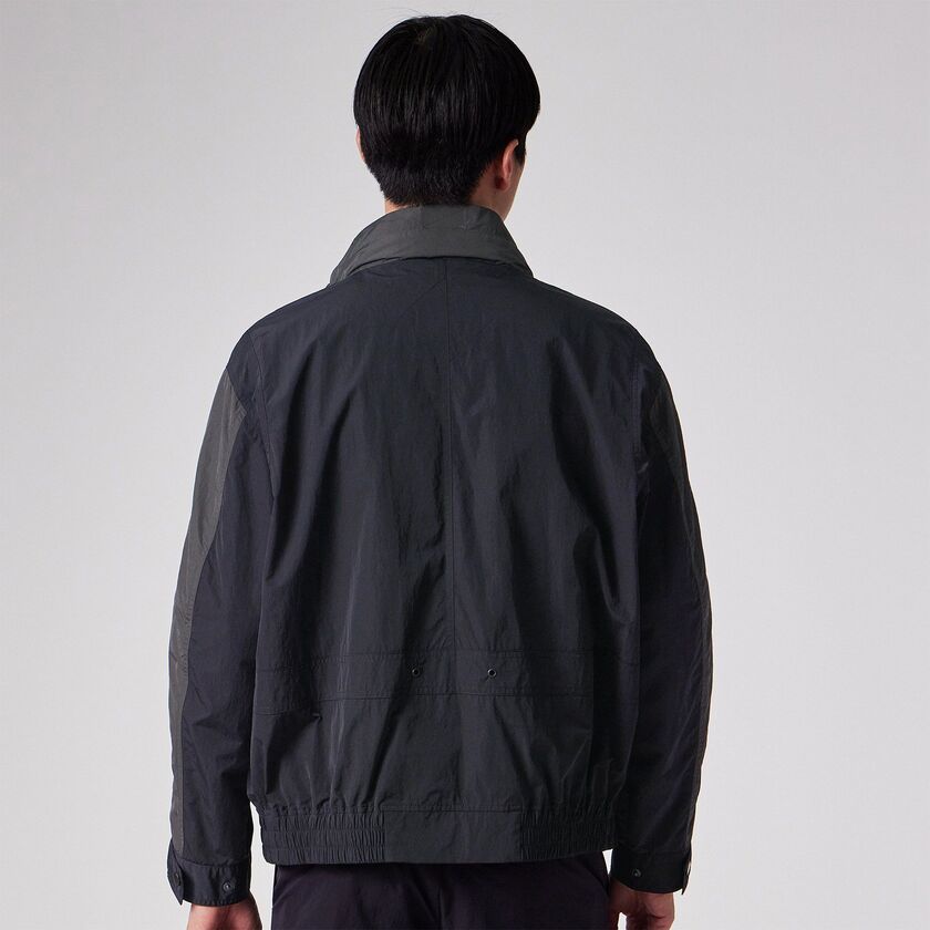 スポーティーなラグランスリーブと、クラシックなスタンドカラーを組み合わせた、ショート丈のブルゾンです。袖と身頃の切り替えを活かしたデザインが特徴で、レトロなアウトドアウェアやコーチジャケットをモダンに再構築したような佇まいです。裾の両サイドにはゴムシャーリングを配しており、着用時に腰回りで自然な丸みが生まれ、立体的なシルエットを形成します。