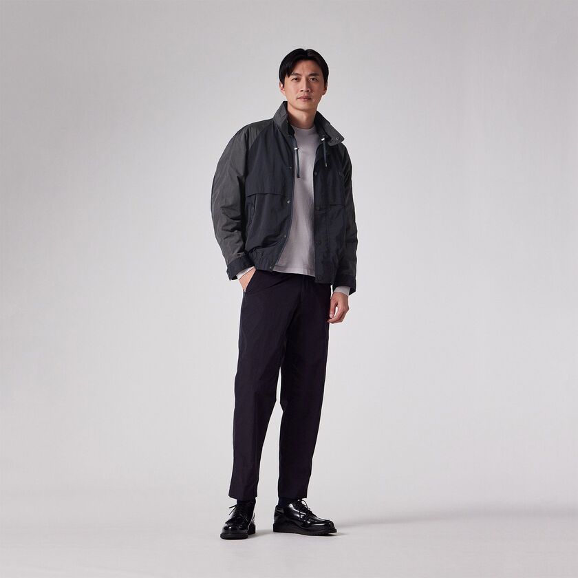 シャツやカットソーの上に羽織るライトアウターとして、春や秋の季節の変わり目に最適です。デニムやチノパンと合わせたカジュアルスタイルはもちろん、素材のマットな質感を活かしてスラックスと合わせれば、都会的なスポーツミックススタイルが完成します。シワが気になりにくい素材感のため、旅行時の携帯用アウターや、少し肌寒い時の羽織りとしても重宝する一着です。