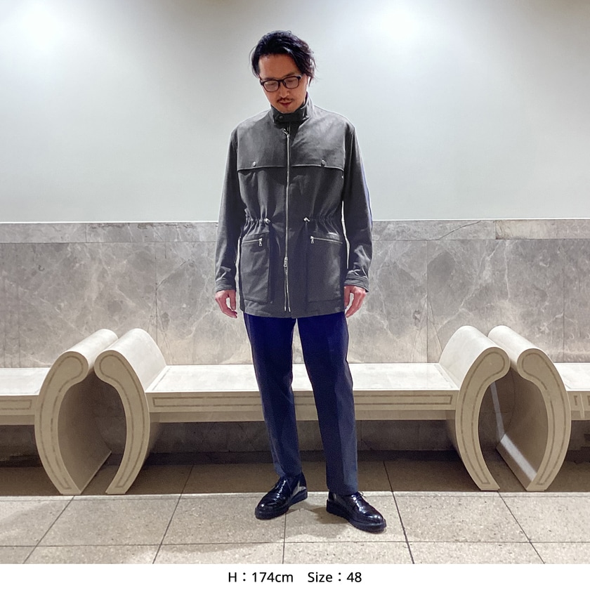 一見するとハードな印象になりがちなスタンドカラーのブルゾンですが、あえてバイカー風の武骨さを抑え、海辺の風を感じさせるような爽やかな「マリンテイスト」に落とし込みました。デザインのアクセントとして、フロントやポケットにあしらったファスナーの金属パーツが、さりげなく洗練された輝きを放ちます。また、通常は内側に隠すウエストのドローコード(絞り紐)をあえて表に出すことで、程よい抜け感とカジュアルさを演出。コードを絞ればシルエットに変化を付けられるため、その日の気分に合わせてメリハリのある着こなしをお楽しみいただけます。