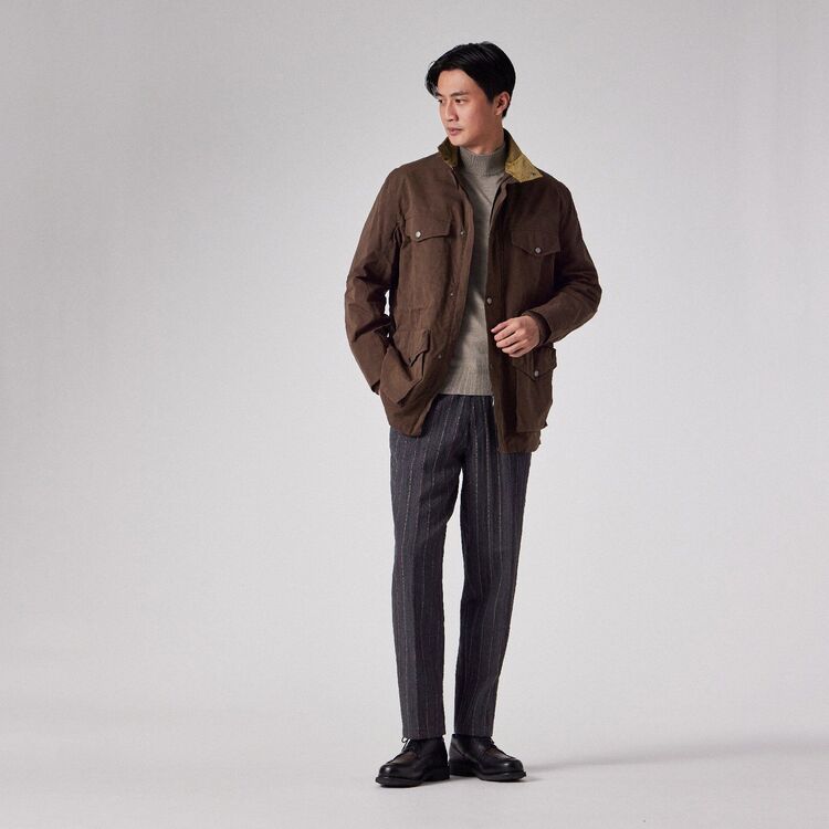 元来は陸軍の野戦用フィールドジャケットをベースに、武骨な雰囲気は残しつつ、現代的なシティウェアとして洗練させたモデル【ALLIER/アリエ】です。特徴的な立体感のある腰ポケットが、機能的でありながらハードになりすぎない絶妙なアクセントになっています。裏地にはクラシックなガンクラブチェック柄を配し、脱いだ時やちらりと見えた際にも大人のこだわりを感じさせます。