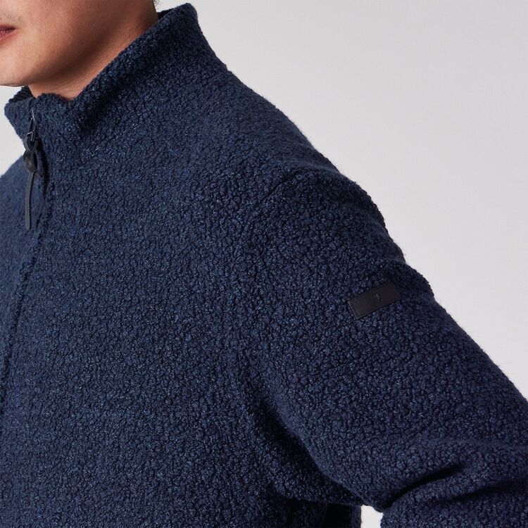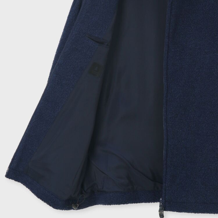 機能面においては、素材の特性が活かされています。ボア素材特有の高い保温性に加え、ウールの持つ天然の防臭性も兼ね備えているため、快適に着用いただけます。また、見た目のボリューム感に反して軽く、快適な着心地を提供します。フロントのフルジップ仕様により、着脱のしやすさや温度調整の容易さも確保されています。