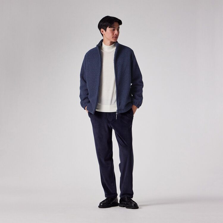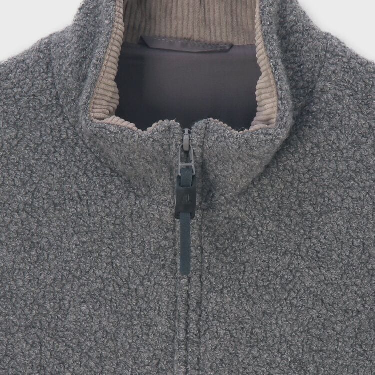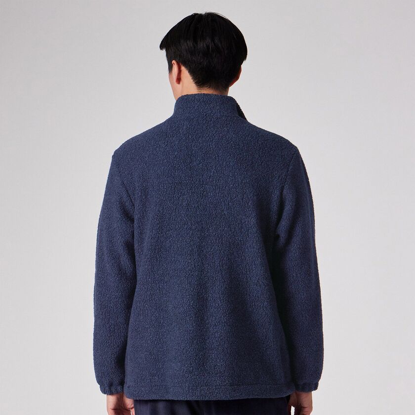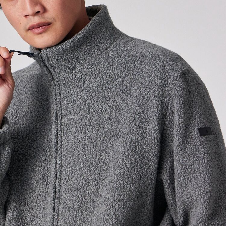 デザインは、スタンドカラーのフルジップブルゾン型を採用しており、シンプルで合わせやすいベーシックな形です。フリース素材のボア感が豊かな表情を作り出し、襟裏には異素材(画像からはコーデュロイと推察される)が使用されており、細部にアクセントを加えています。全体としては、素材の質感を活かしたカジュアルながらも洗練されたデザインです。