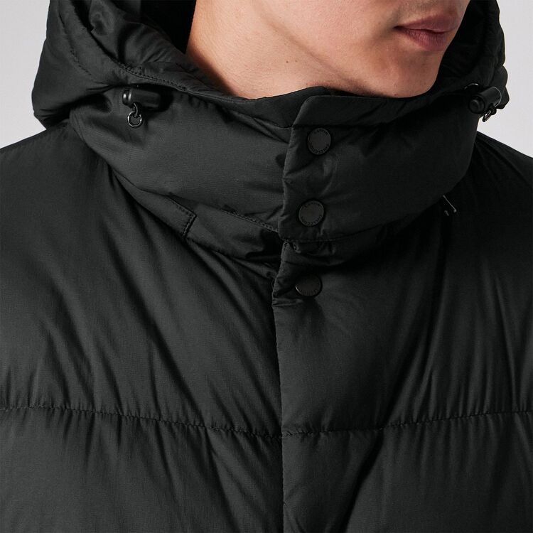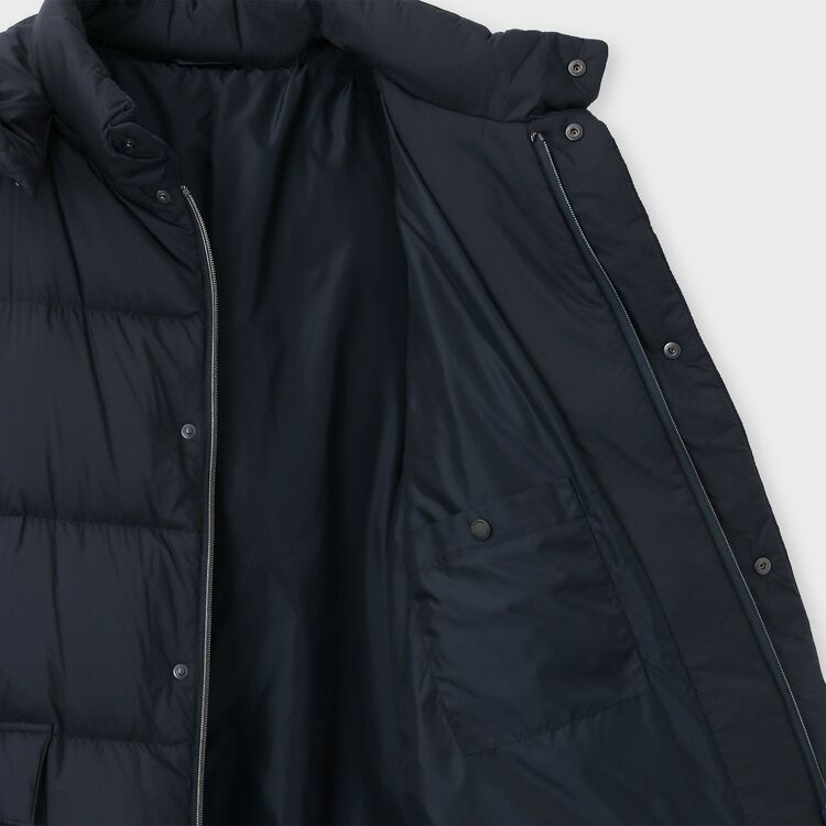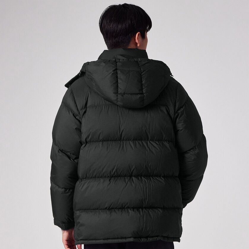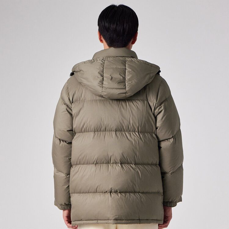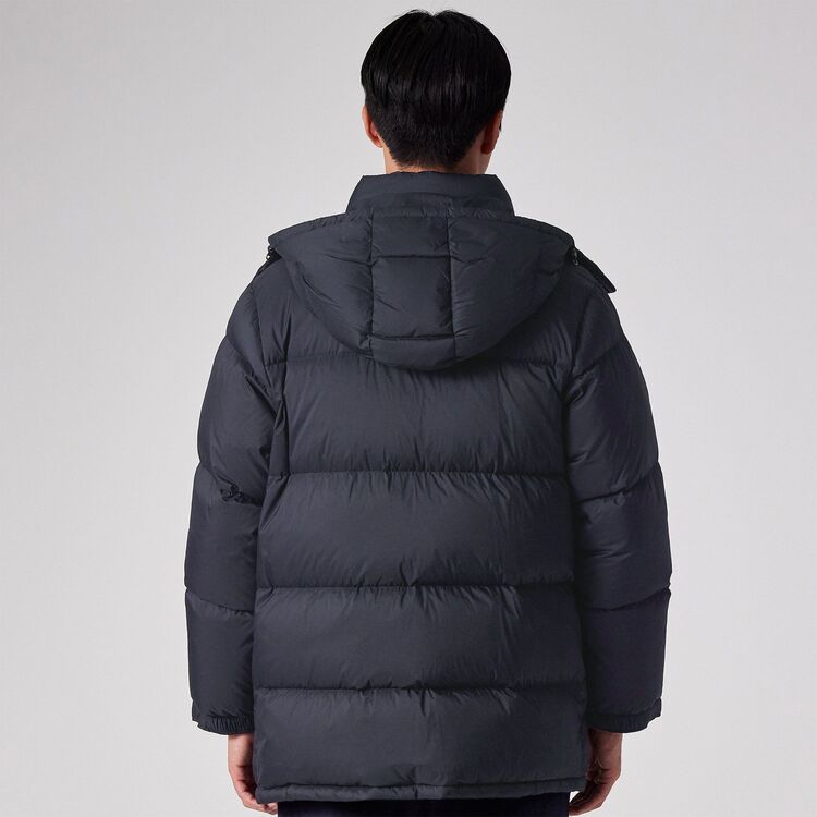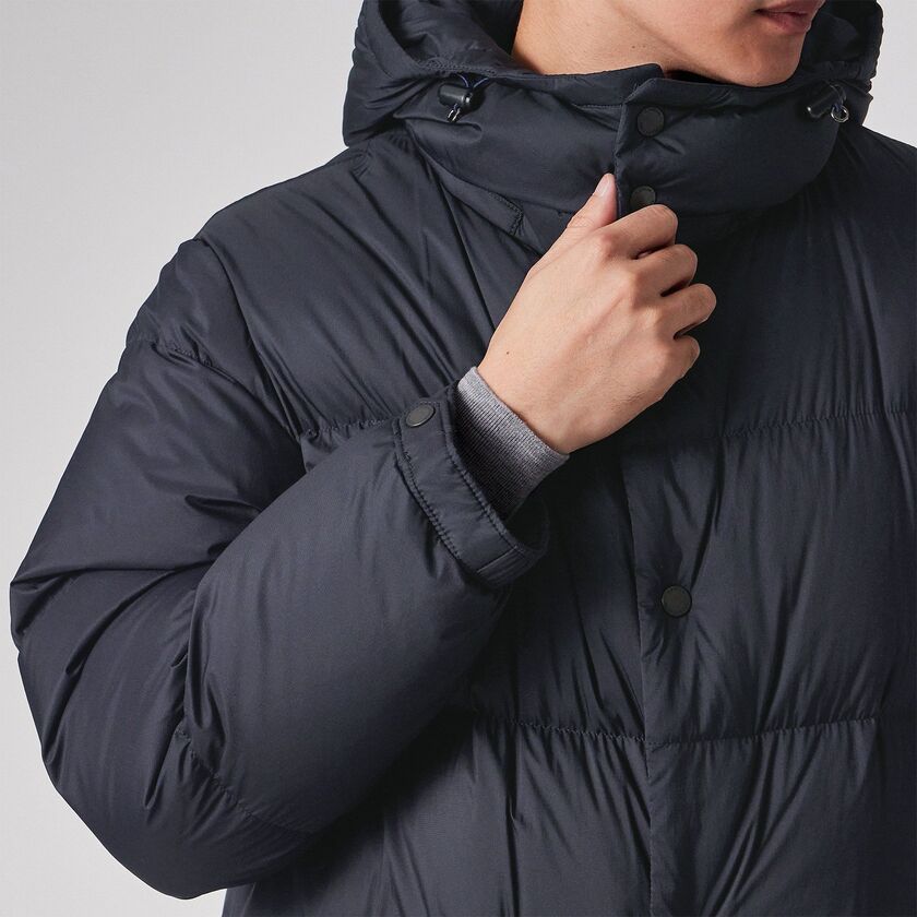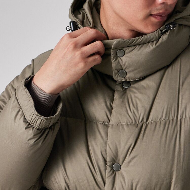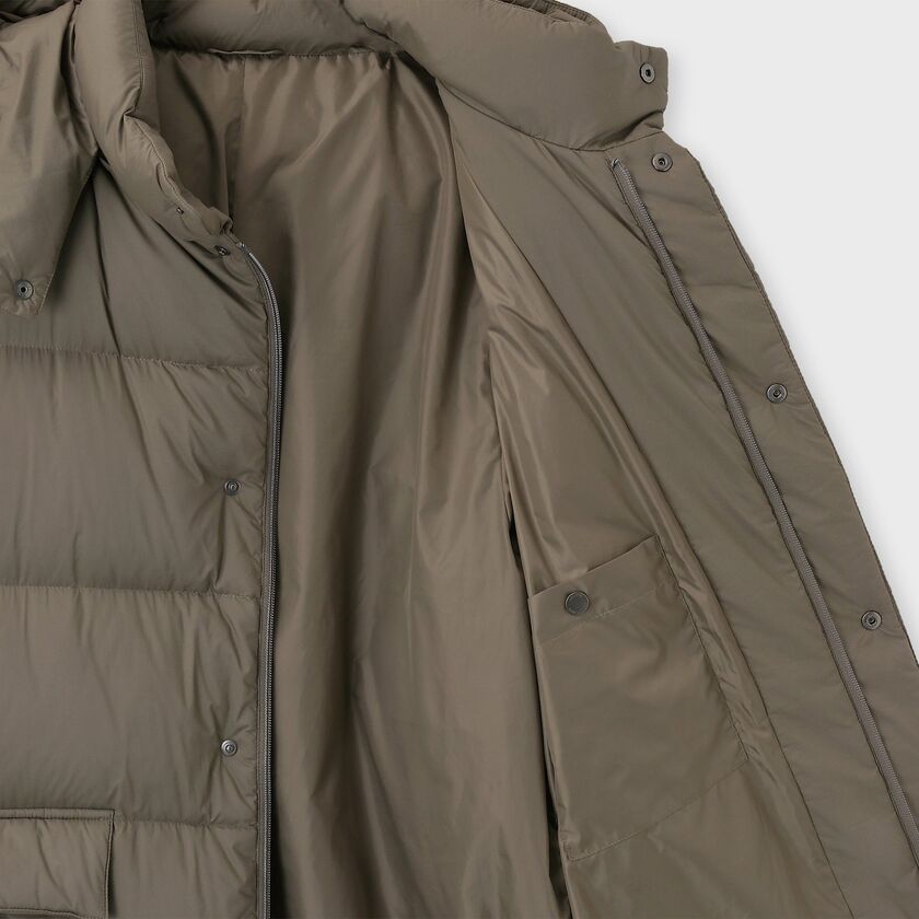 クラシックな雰囲気を持つダウンジャケットで、ヒップが隠れるほどのオーバーサイズのゆったりとしたフィット感が特徴です。フードは取り外しが可能で、スタンドカラーのダウンジャケットとしても楽しめ、気分やシーンに合わせて着こなしを変えることができます。