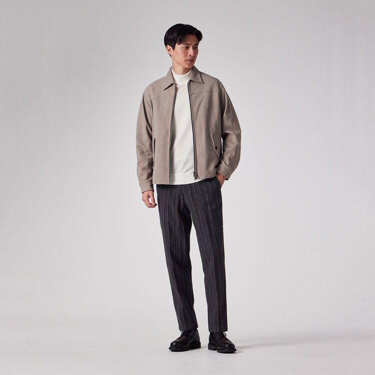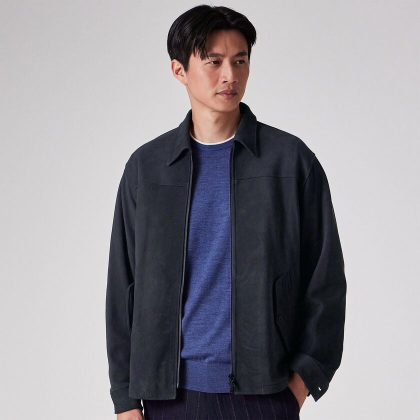 シンプルな襟付きのライダースタイプを採用したショートブルゾンです。装飾を極力抑えることで、レザー特有のハードな印象を和らげ、どなたでも着こなしやすい上品なルックスに仕上げています。素材の持つ圧倒的な上質さが際立つミニマルなデザインは、大人の男性にふさわしい洗練された佇まいを演出します。