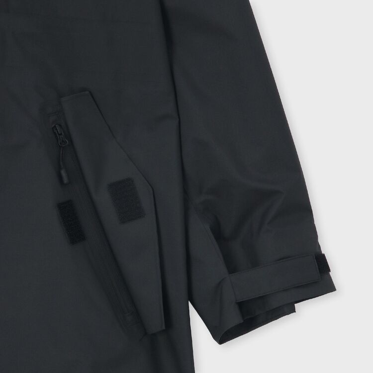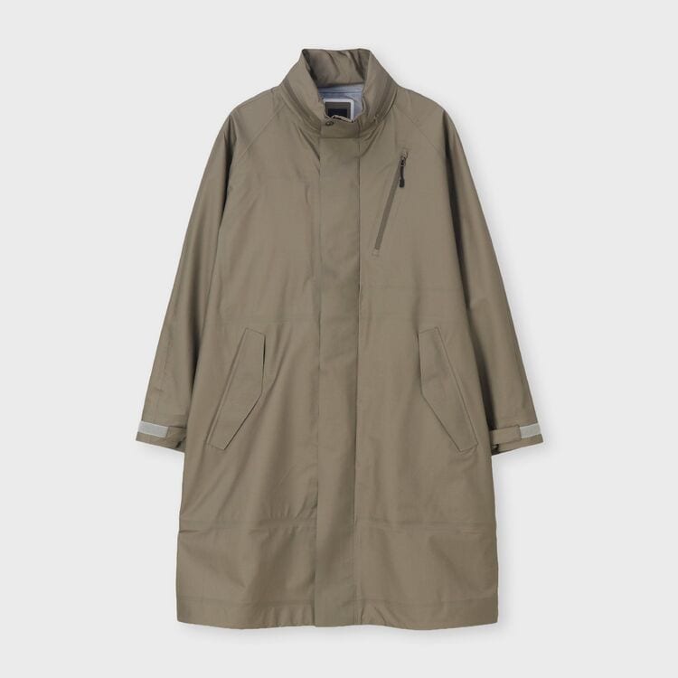 素材の特性を活かし、縫い目をシームテープで組み立てたスタンドカラーのロングコートです。スタンドカラー内にはフードを収納しており、普段はすっきりとした首元を演出します。ゆったりとしたサイジングに設計されているため、ジャケットの上からでも無理なく着用可能なシルエットです。
