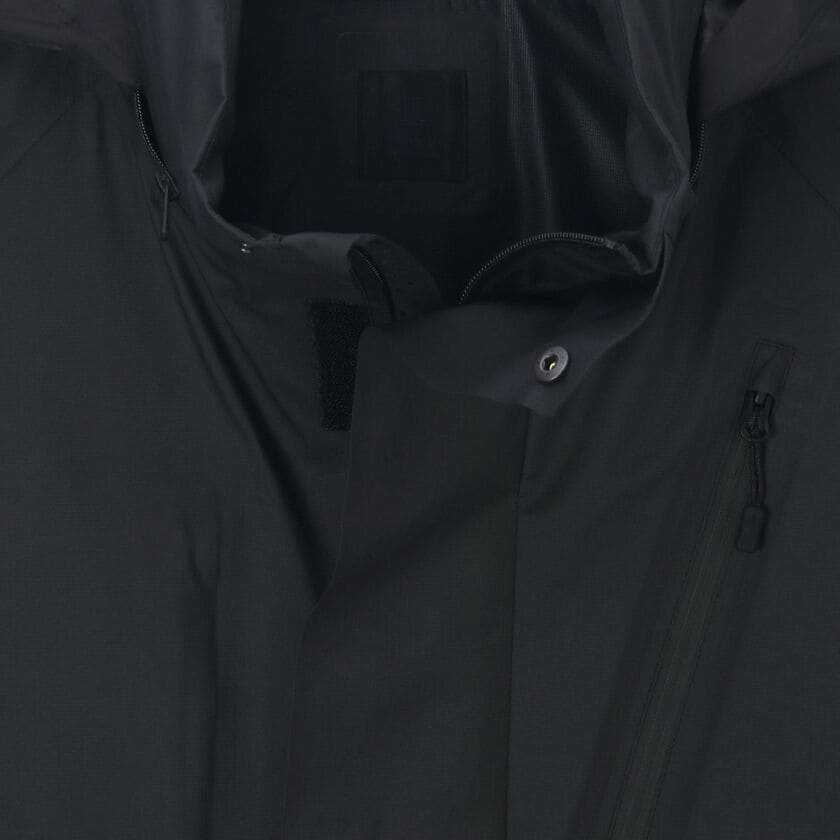 防風、透湿、撥水という高い機能性を持ち、スタンドカラー内のフードを使用することで小雨にも対応可能です。また、3レイヤー構造でありながら、通常の軽量ナイロン並みの軽さを実現しており、快適な着心地を提供します。