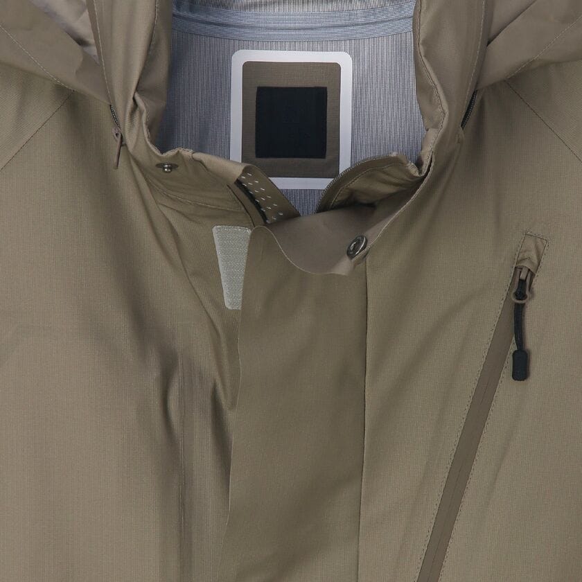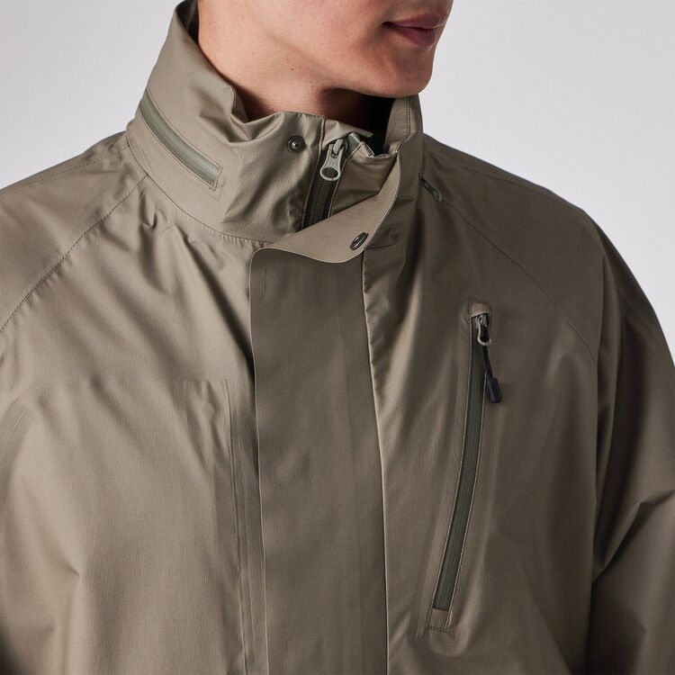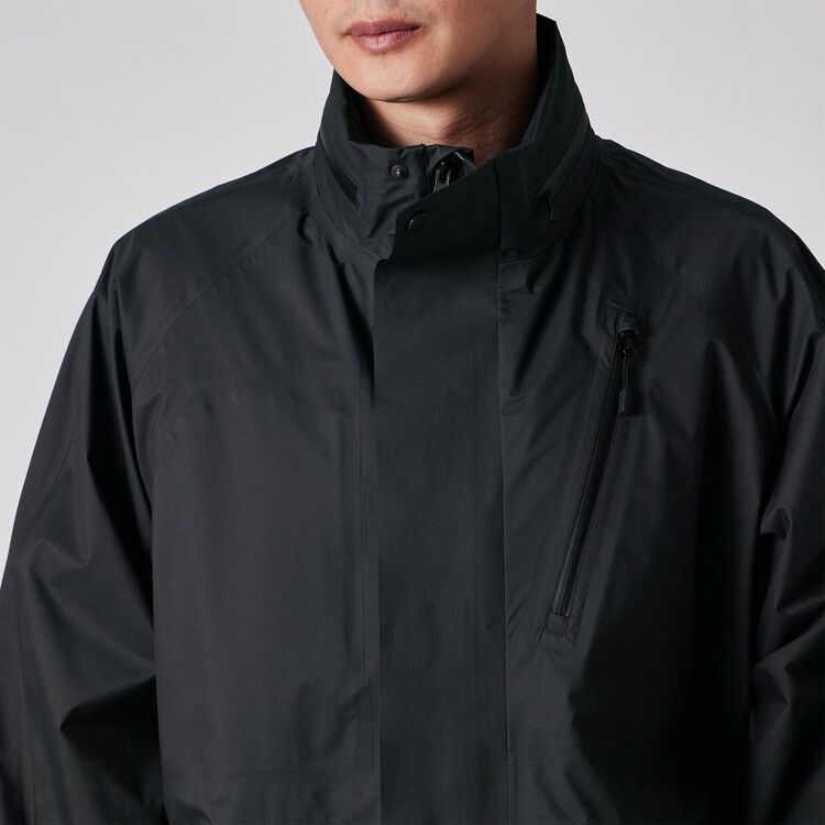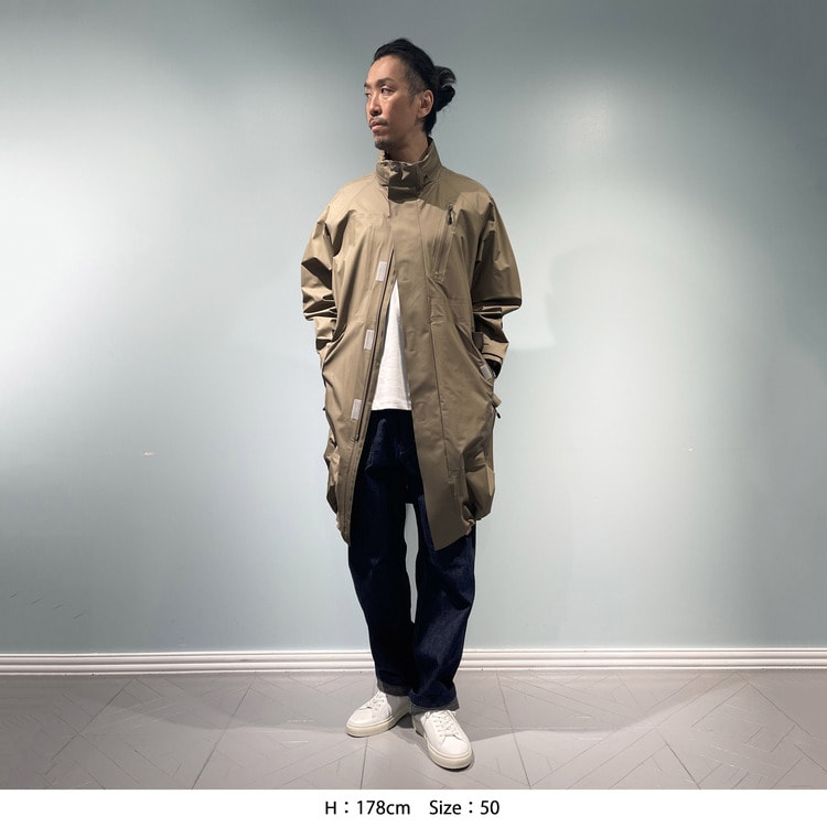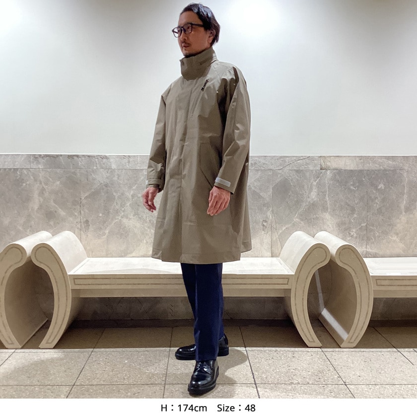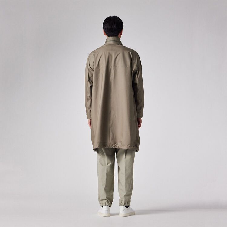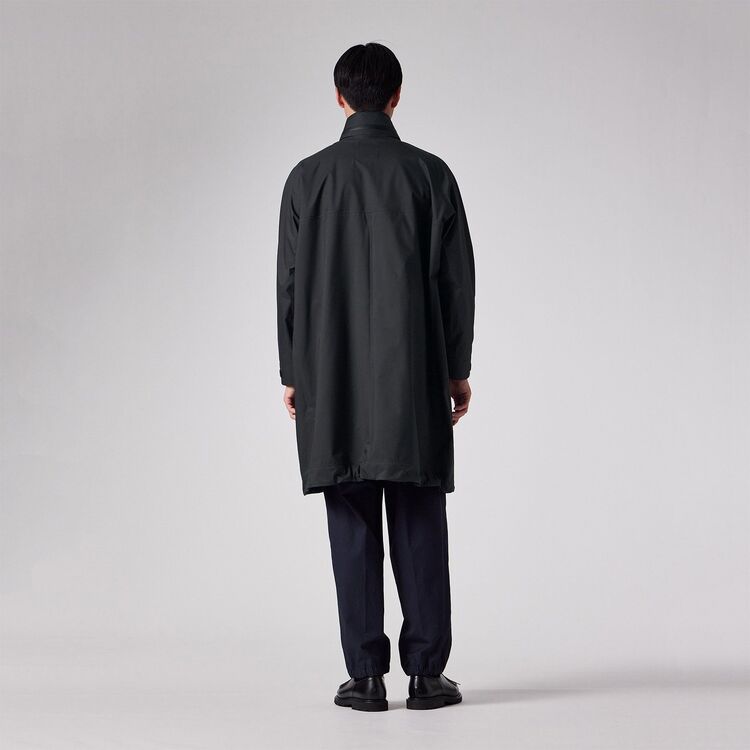 縫い目を表に出さず、特殊なシームテープで圧着して組み立てることで、ステッチ(縫い目)の凹凸がない非常にフラットで洗練された表情に仕上げています。この仕様は見た目の美しさだけでなく、水や風の侵入を防ぐ役割も果たしています。襟元はシャープなスタンドカラーですが、襟の中にフードが収納されています。急な雨や風の強い日にはサッと取り出せますし、普段は襟にしまっておくことで、顔周りをすっきりとスマートに見せてくれます。シルエットは今どきのゆとりを持たせたサイジングです。スーツや厚手のジャケットの上から羽織っても肩周りが突っ張らず、美しいAラインのシルエットを保ちます。