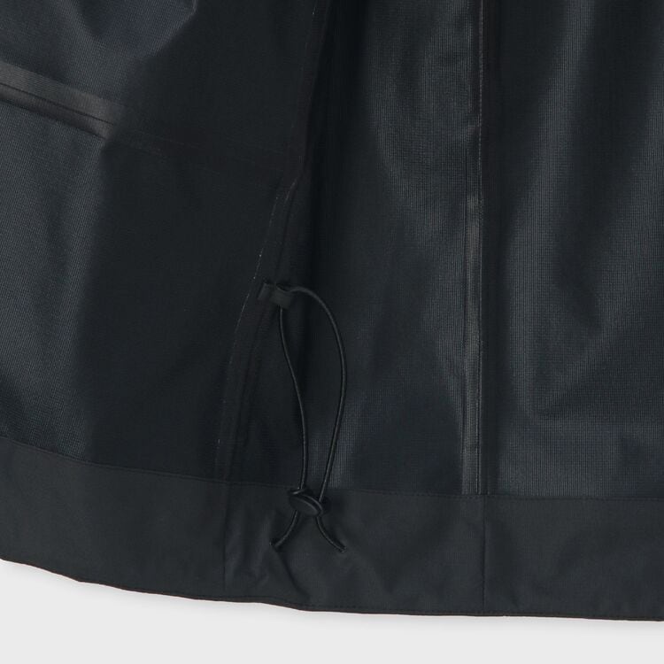 極細の「7デニール」という超軽量ナイロンタフタを表地に使い、裏側には肌離れのよいトリコット生地と特殊フィルムを貼り合わせています。通常、3枚の素材を貼り合わせる(ボンディングする)と生地は硬く重くなりがちですが、こちらは「63g/㎡」という驚異的な軽さを達成しました。これは一般的なシャツ生地よりも軽いレベルです。紙のように薄いのに、ハリがあり、強靭です。マットで高級感のある質感が、大人のスタイルを格上げします。