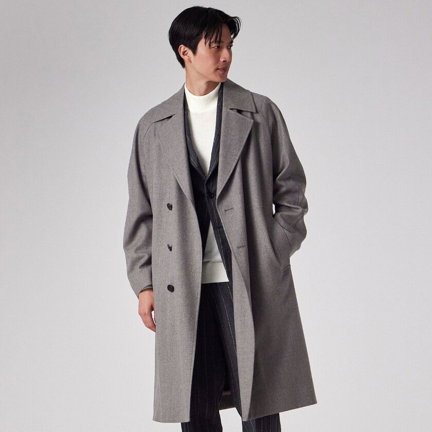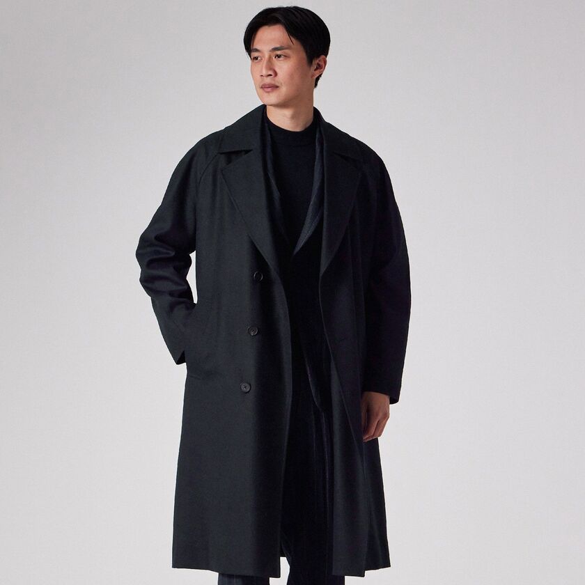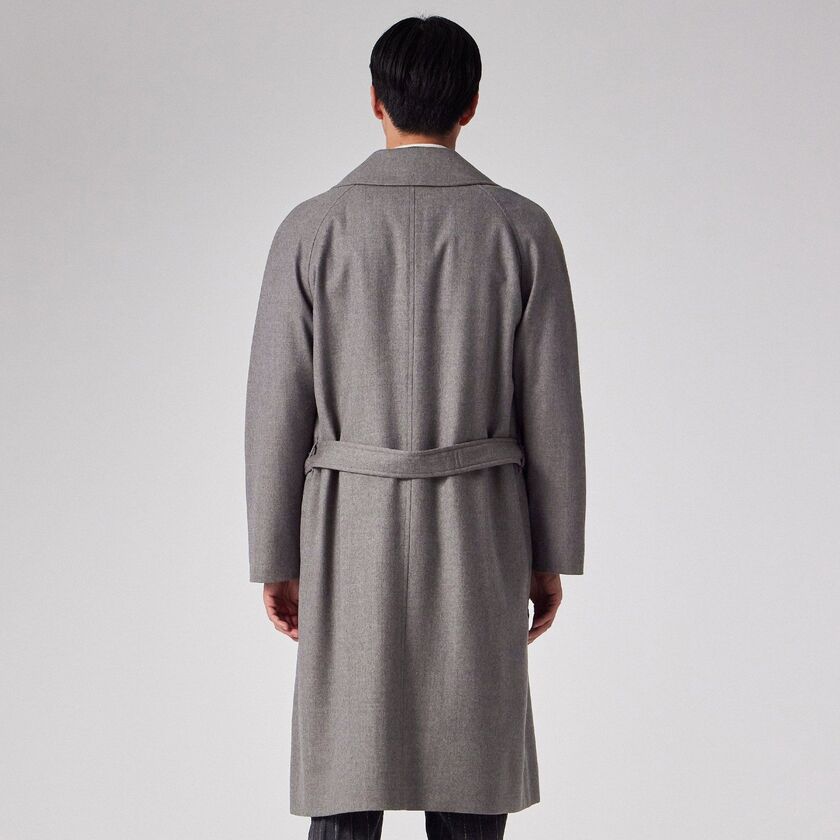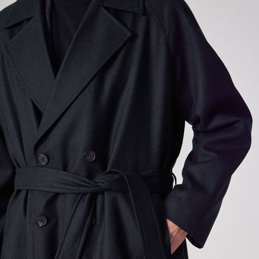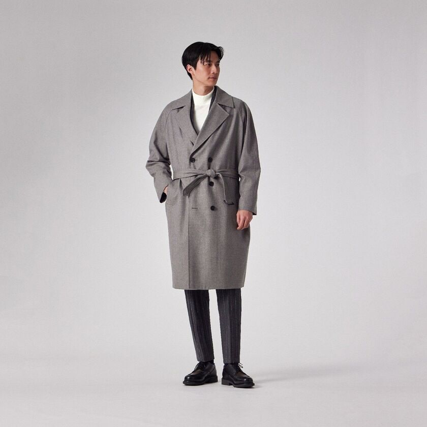 デザインは、クラシックな装いながらも現代的なエッセンスを取り入れたシンプルなベルテッドのダブルブレスト仕様、タイロッケンコートです。カチッとした印象になりすぎないよう、あえてオーバーサイズに設計されており、身体を優しく包み込むようなザックリとしたフィッティングでお召しいただけます。この独特な落ち感とシルエットこそが、素材の持つドレープ性を最大限に引き出す鍵となっています。