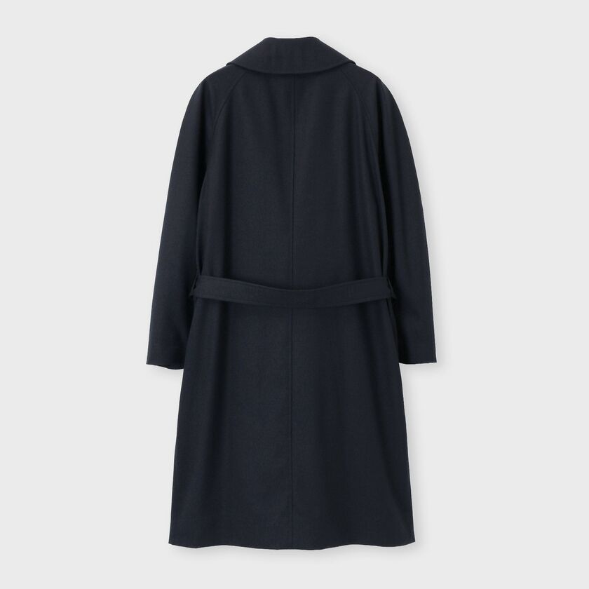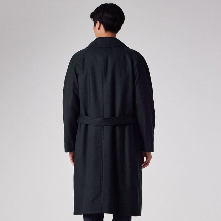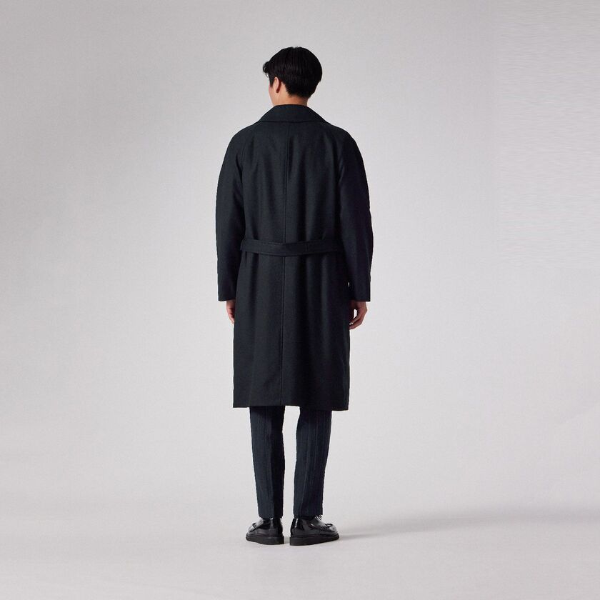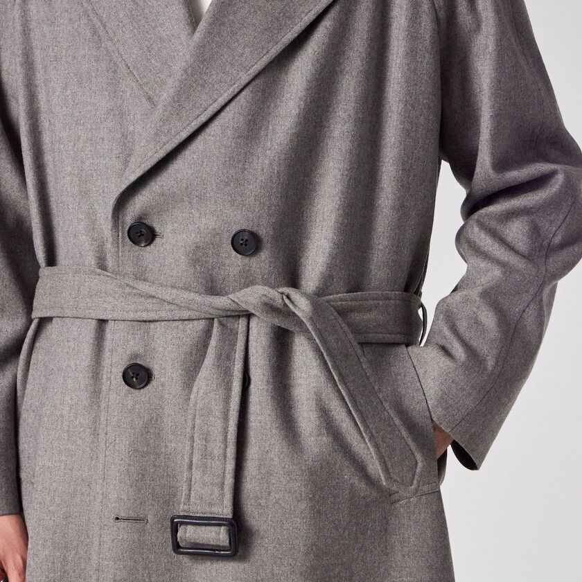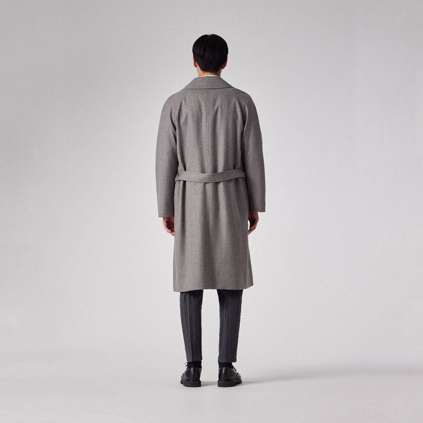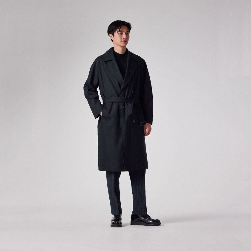 デザインは、クラシックな装いながらも現代的なエッセンスを取り入れたシンプルなベルテッドのダブルブレスト仕様、タイロッケンコートです。カチッとした印象になりすぎないよう、あえてオーバーサイズに設計されており、身体を優しく包み込むようなザックリとしたフィッティングでお召しいただけます。この独特な落ち感とシルエットこそが、素材の持つドレープ性を最大限に引き出す鍵となっています。