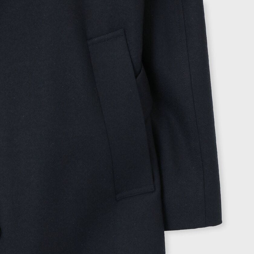 このコートの機能性は、まず素材の特性に起因します。しっかりとした380gの目付と、高密度織りからのミルド加工(縮絨加工)を経たフランネルは、高い断熱性と保温性を持ち、真冬でも暖かく着用できる優れた防寒性を誇ります。また、オーバーサイズの設計は、厚手のジャケットやニットの上からでもストレスなく羽織れる快適な着心地と重ね着のしやすさを提供します。さらに、ベルテッド(帯状のベルト)仕様のため、ベルトを締めてウエストマークすることでメリハリのあるシルエットを、開けて着用することで素材のドレープを活かしたリラックスしたシルエットを、シーンに合わせて自在に調整することが可能です。