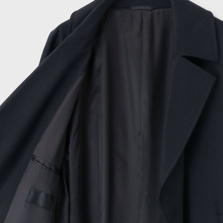 このコートの最大の魅力は、そのエレガントな余裕の演出にあります。オーバーサイズのフィッティングと素材の持つ独特のドレープ性が相まって、着用するだけで洗練された大人の雰囲気を醸し出します。重厚な生地感と暖かさで、秋冬のメインアウターとして活躍。ビジネスシーンはもちろん、普段のカジュアルな装いにも羽織るだけで、着こなし全体をワンランク格上げしてくれる、リラックスしてエレガントに着こなしたい方に最適な一着です。