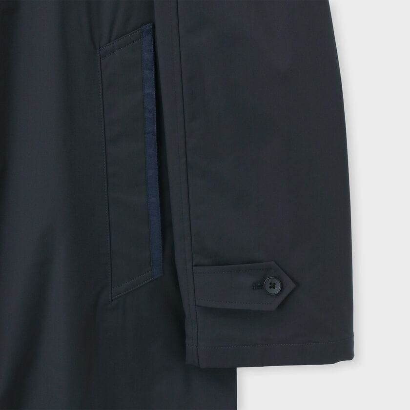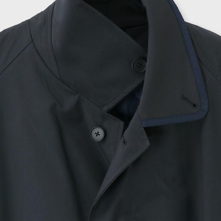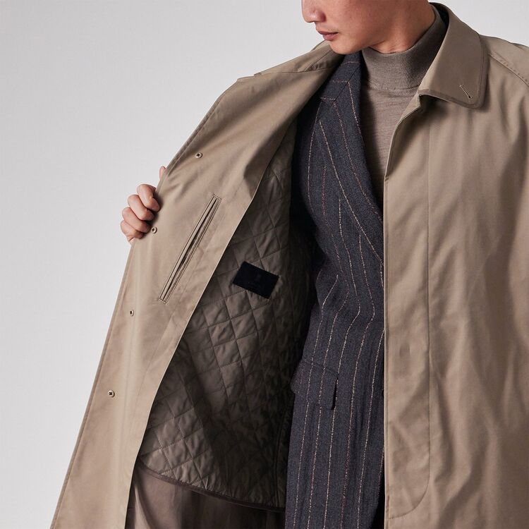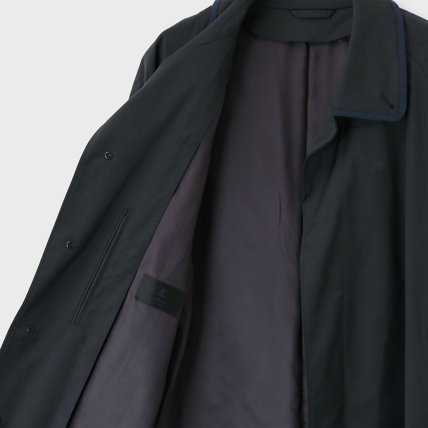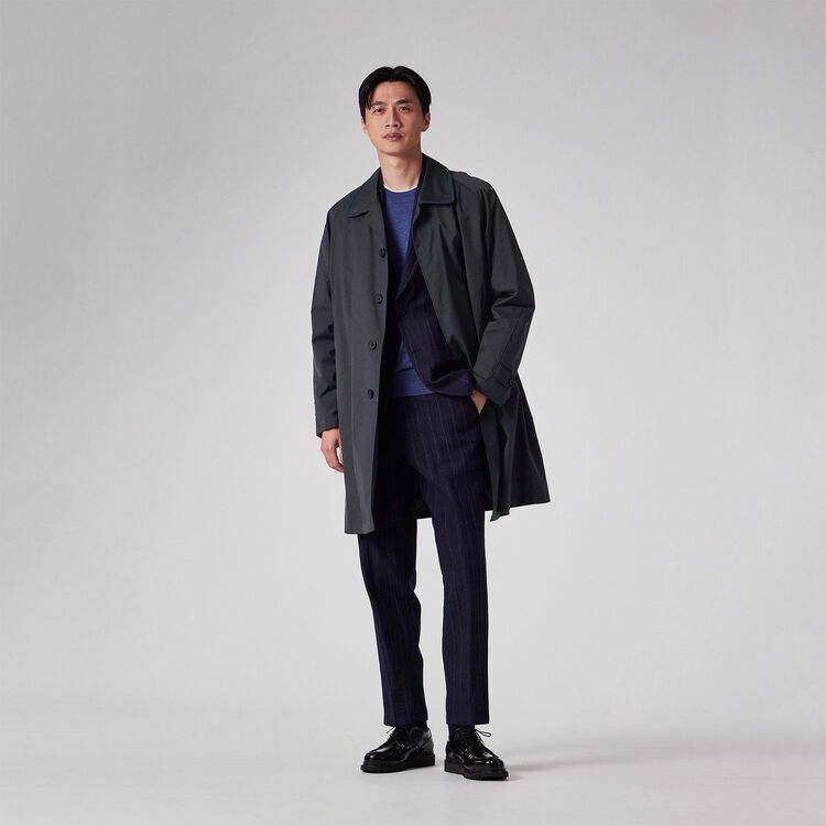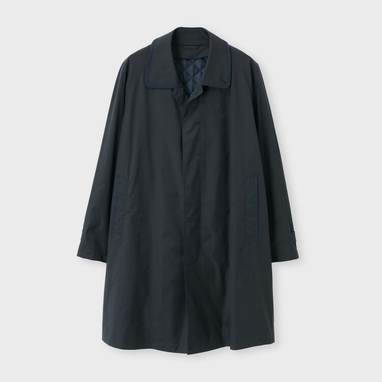 このコートは、クラシックなスタイルであるステンカラーコートをベースにデザインされています。シンプルで普遍的ながらも、衿とポケット口に配されたグログランテープがデザインのアクセントとして効いています。このテープ使いにより、ベーシックな形の中にさりげないモダンなエッセンスが加えられ、洗練された印象を与えます。
