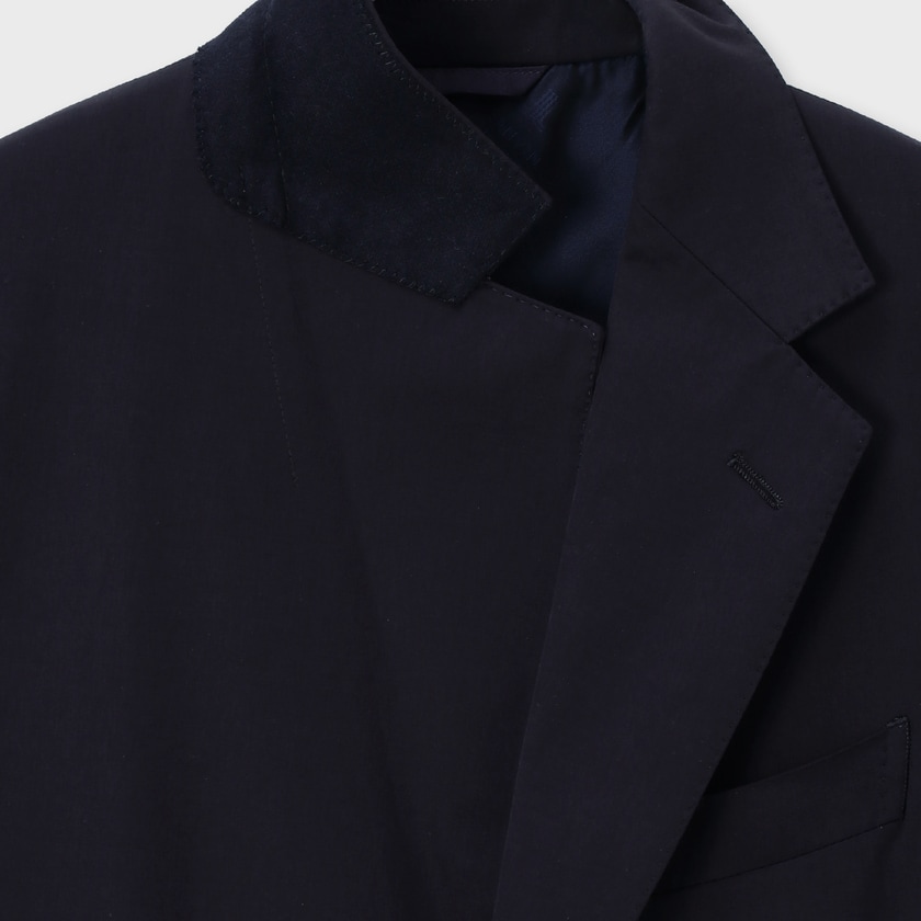 ベーシックな形をベースにしながらも、腰のポケットを外側に縫い付ける「パッチポケット」仕様にすることで、程よくカジュアルな抜け感を取り入れたデザインが特徴です。襟元からフロントにかけて施されたさりげないステッチが、全体の印象を品良く引き締めています。大人の余裕を感じさせる、上品でありながらも親しみやすいスマートな一着に仕上がっています。
