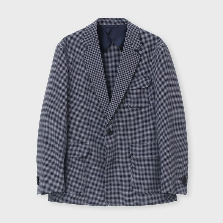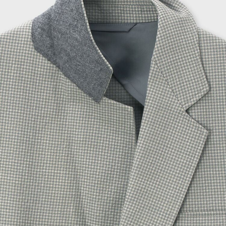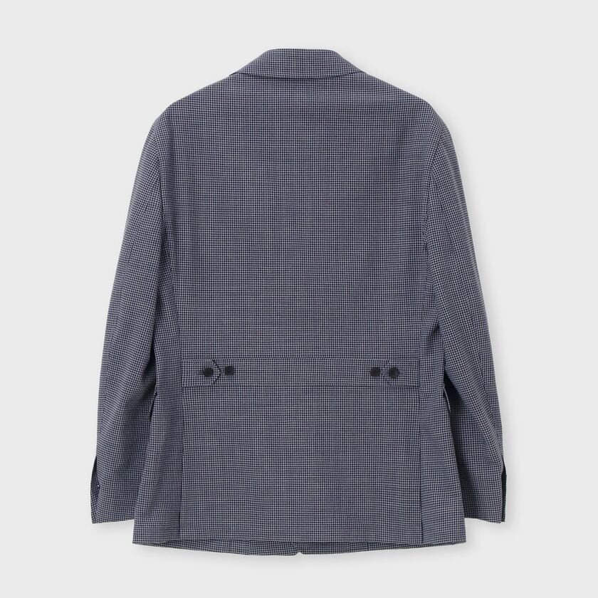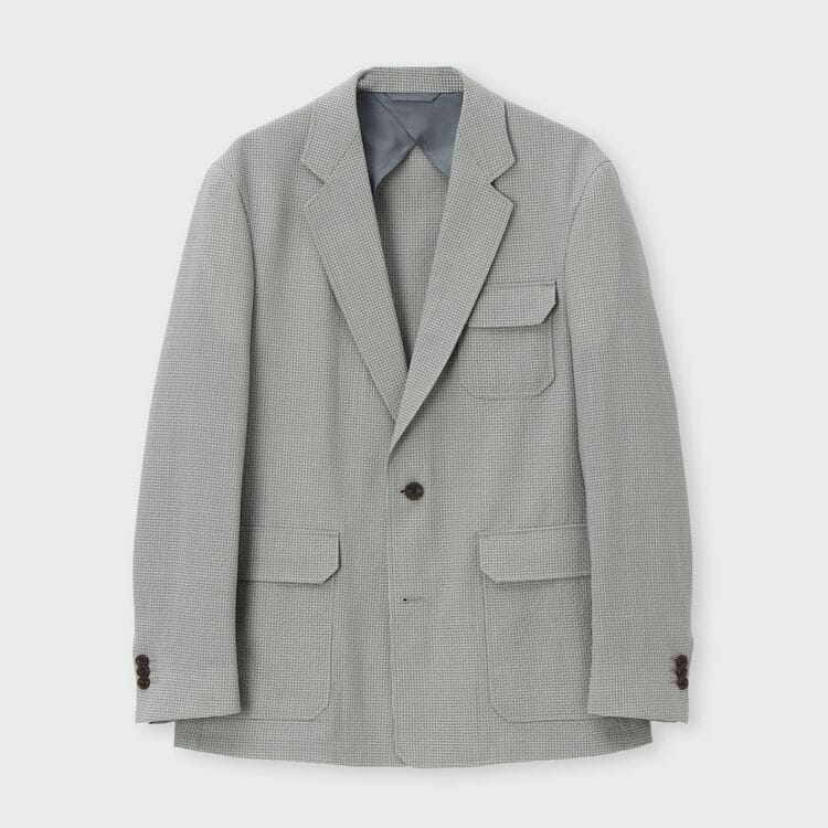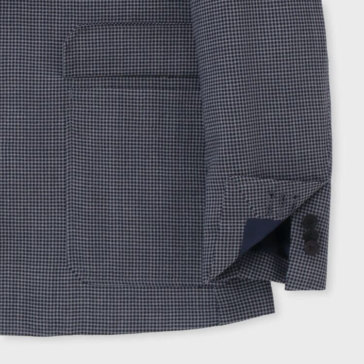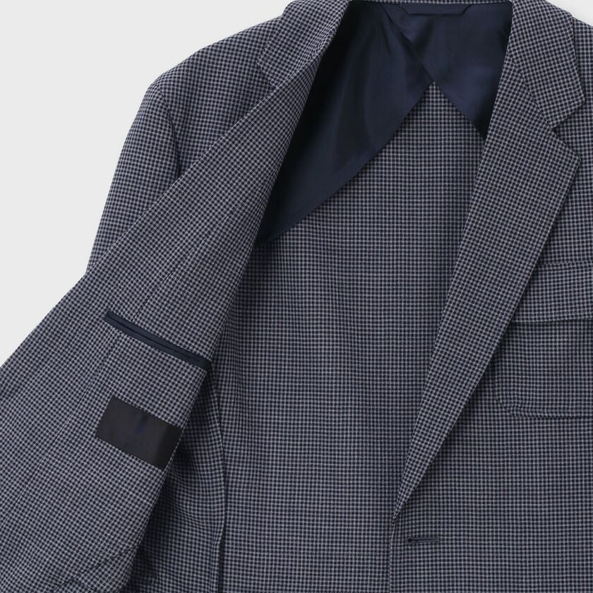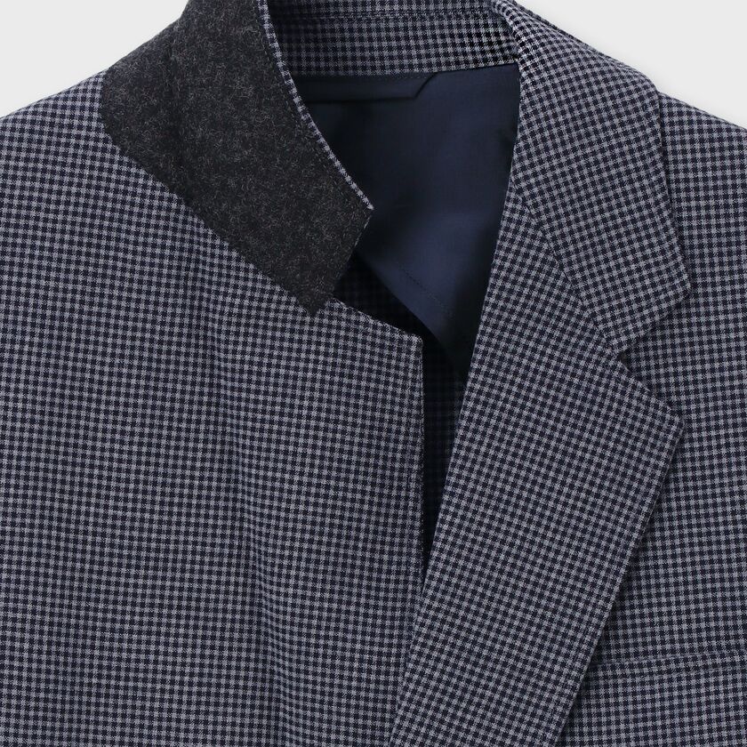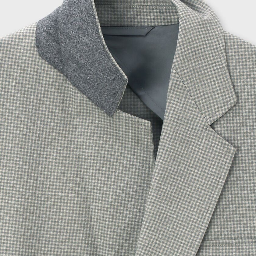 非常に細かいチェック柄を使用しており、遠くから見ると無地のようにシンプルに見えますが、近づいてみると緻密な柄が美しく浮かび上がります。胸元には生地を上から縫い付けたポケットをあしらい、フォーマルになりすぎず、程よくリラックスした雰囲気を加えています。生地の表面にはわずかな凹凸が施されており、光の加減で陰影が生まれます。見た目にも涼しげで、上品な印象を与えてくれるデザインです。