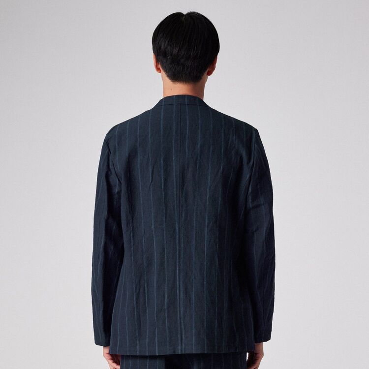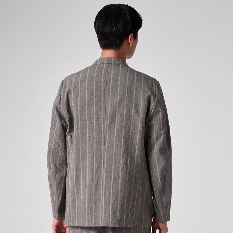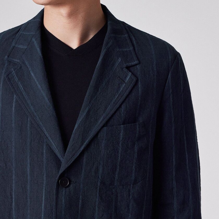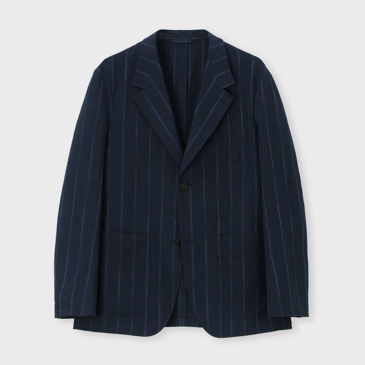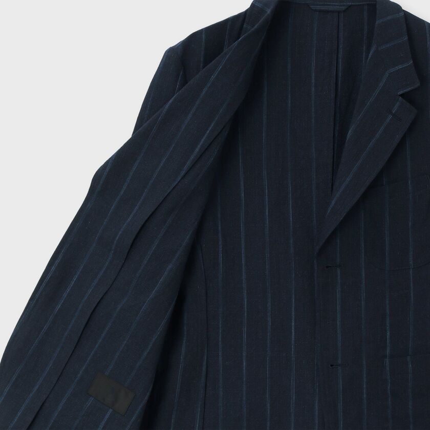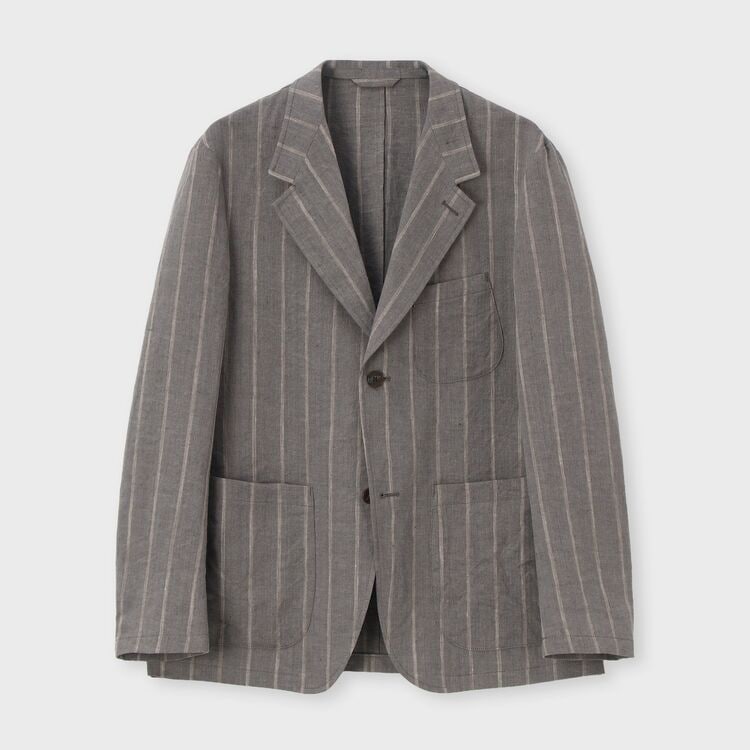 全体にあしらわれたストライプ柄が特徴のジャケットです。腰部分には外側に縫い付けられたポケット(パッチポケット)を採用し、程よくカジュアルな雰囲気を持たせています。裏地を極力省いた軽い仕立てで、袖口にボタンがないシンプルな作りになっています。