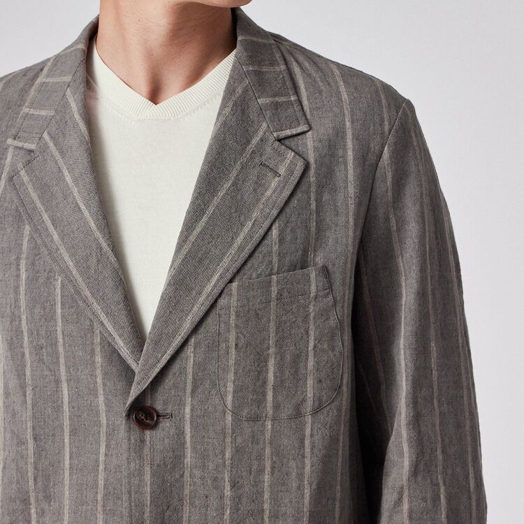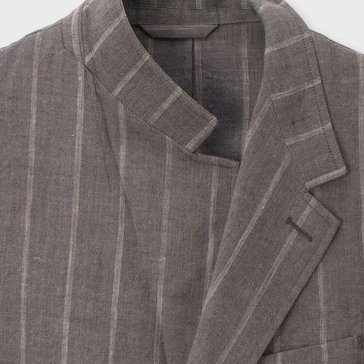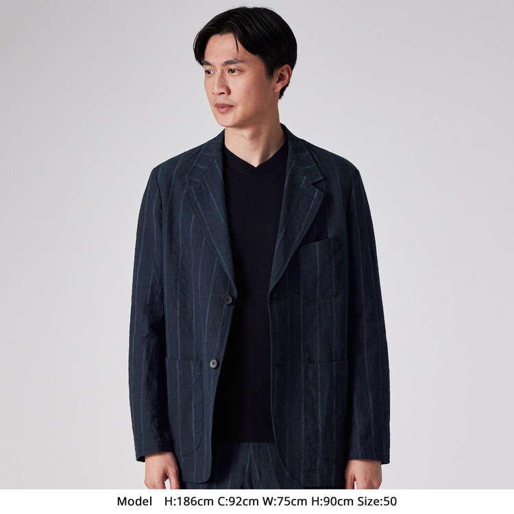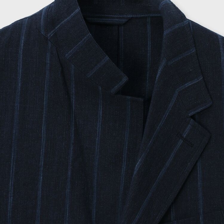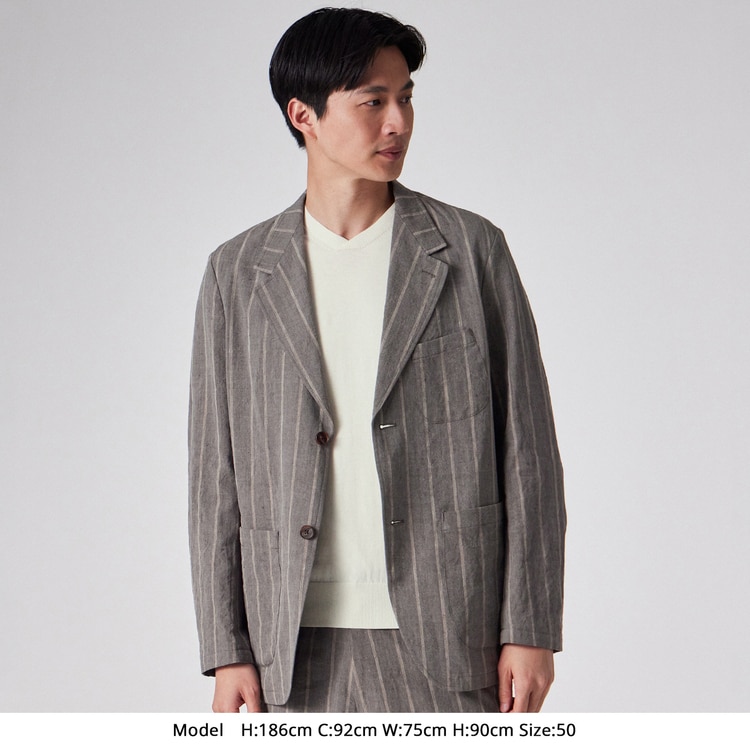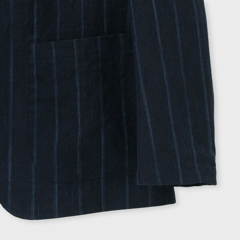 全体にあしらわれたストライプ柄が特徴のジャケットです。腰部分には外側に縫い付けられたポケット(パッチポケット)を採用し、程よくカジュアルな雰囲気を持たせています。裏地を極力省いた軽い仕立てで、袖口にボタンがないシンプルな作りになっています。