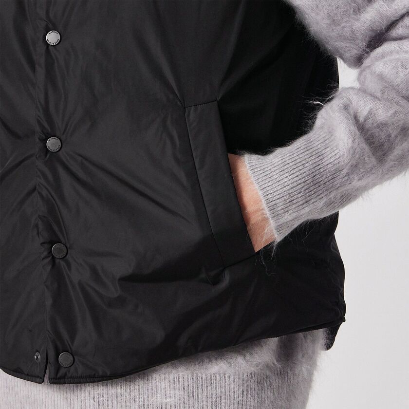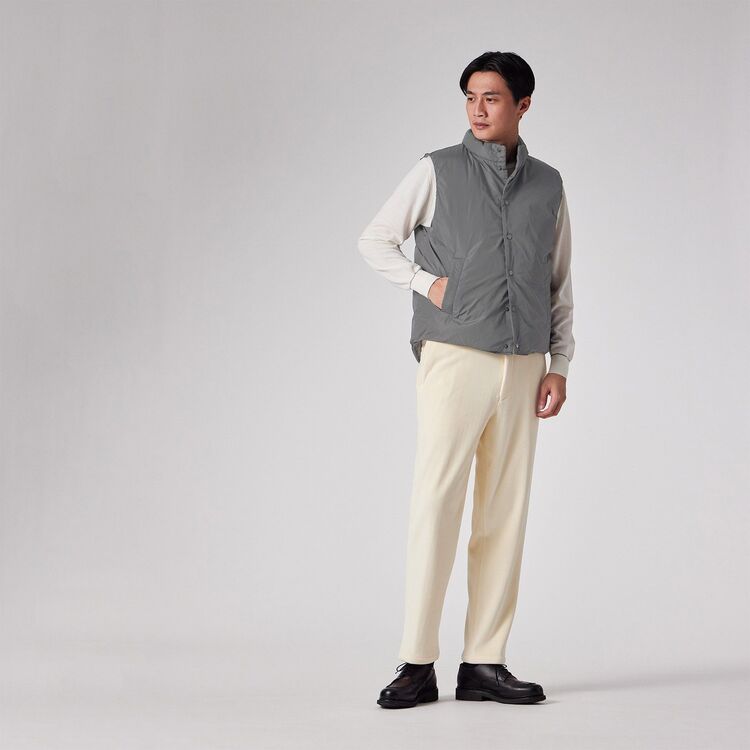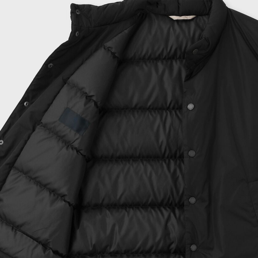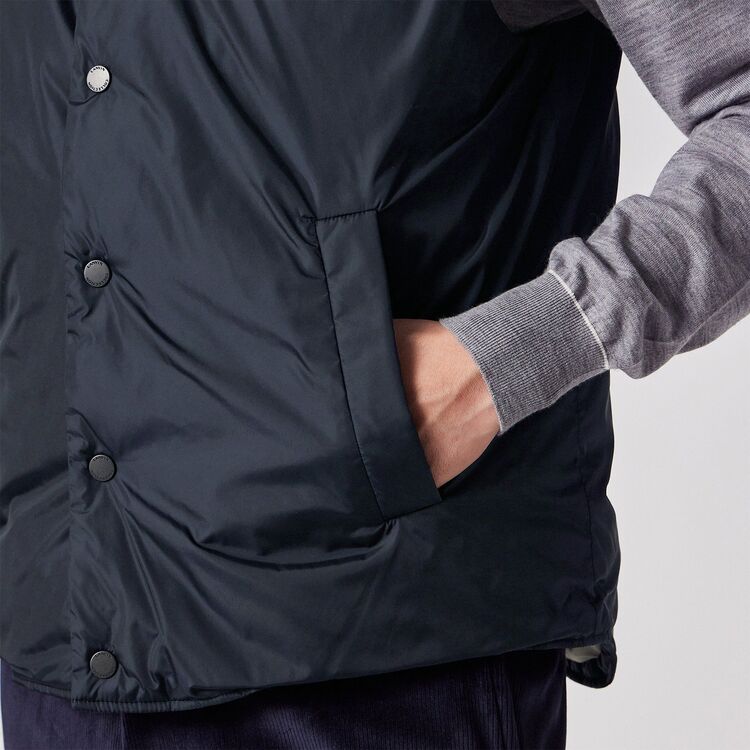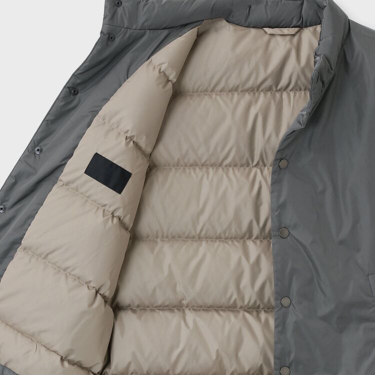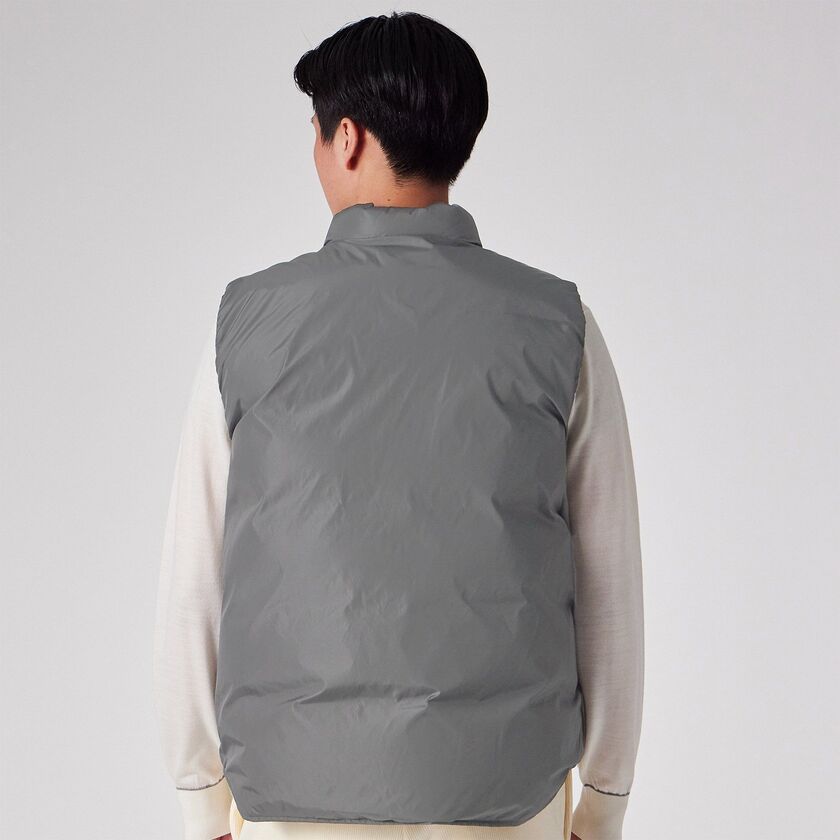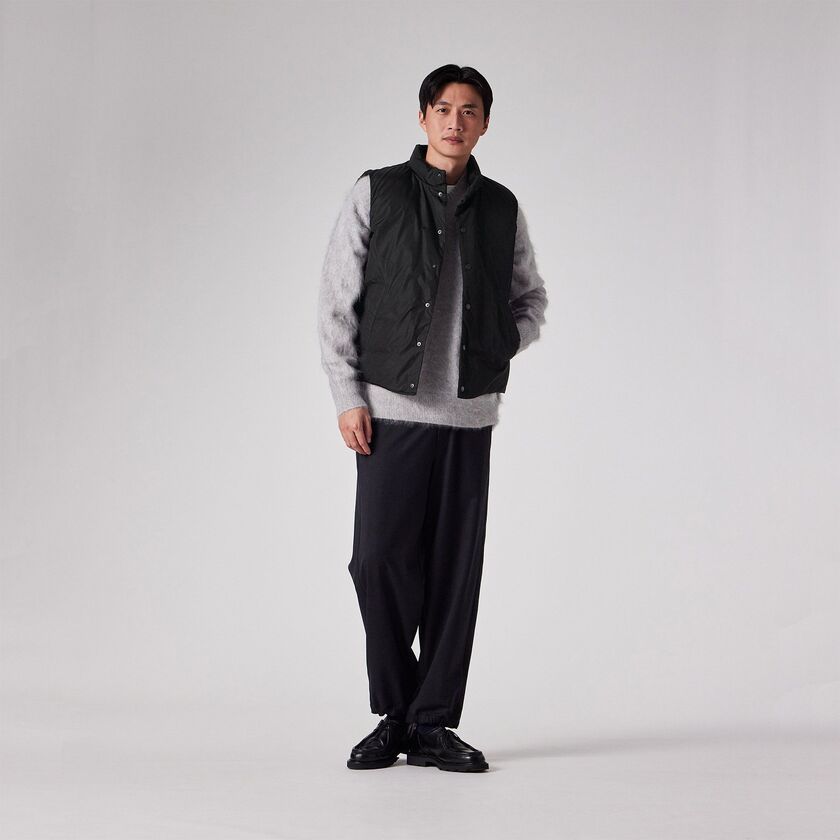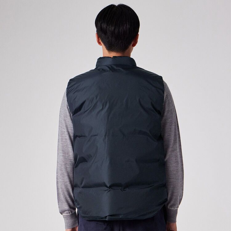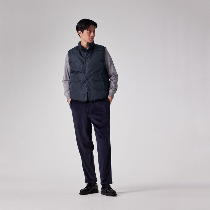 表面にキルトステッチを出さないエレガントな仕上がりが特徴のダウンベストです。襟元は、ハイネックのニットなどをインナーに着込んでも自然に見えるような、絶妙な高さのスタンドカラーを採用。カラーはネイビー、ブラック、ライトグレーの3色展開です。