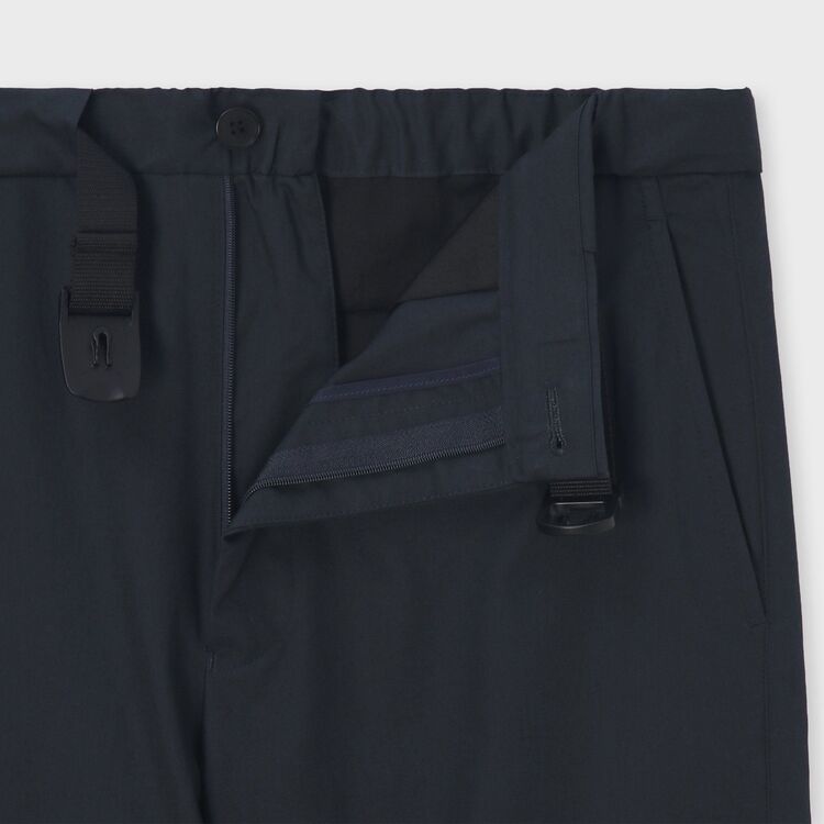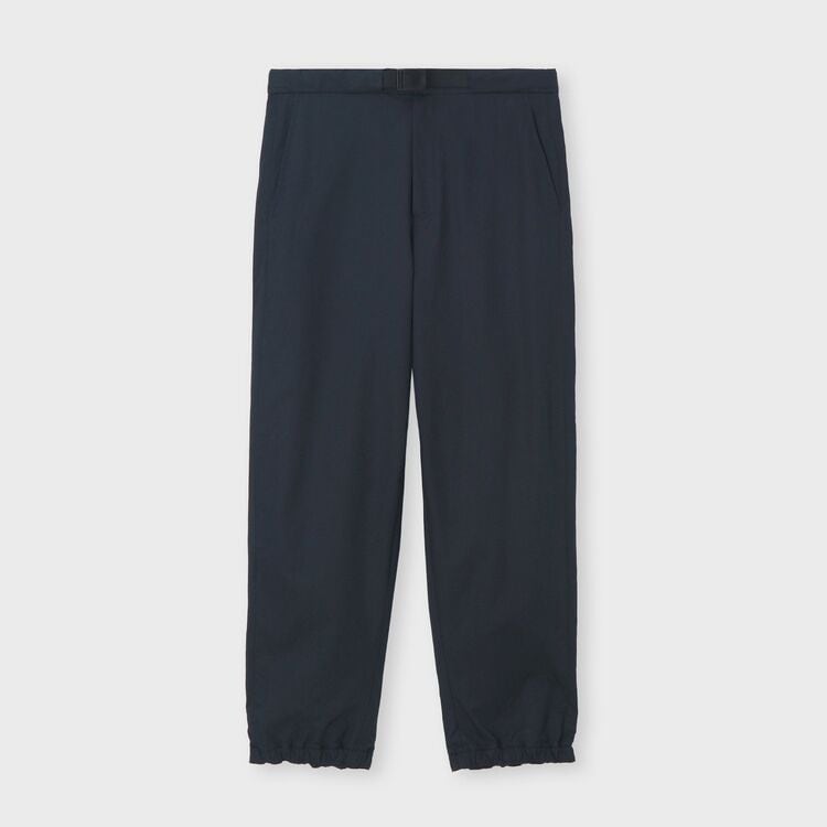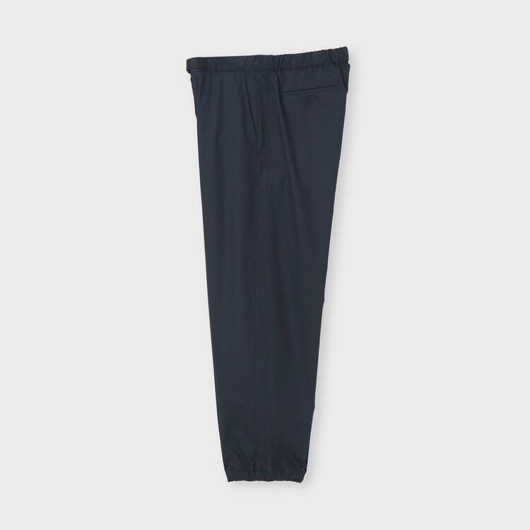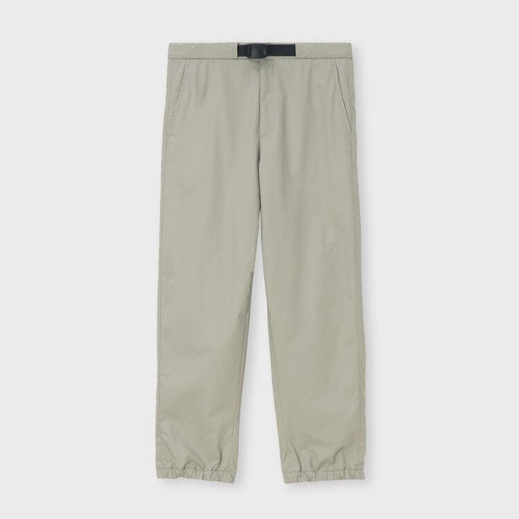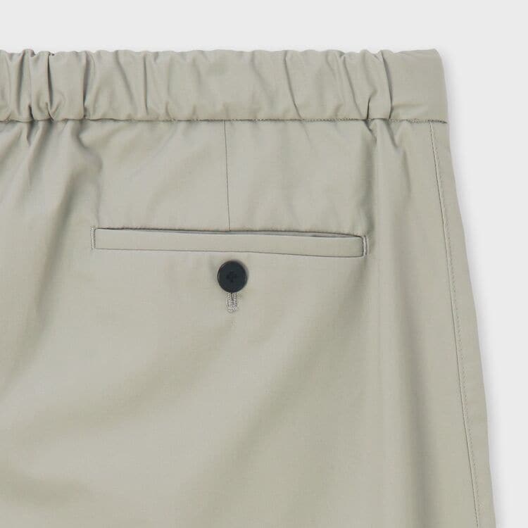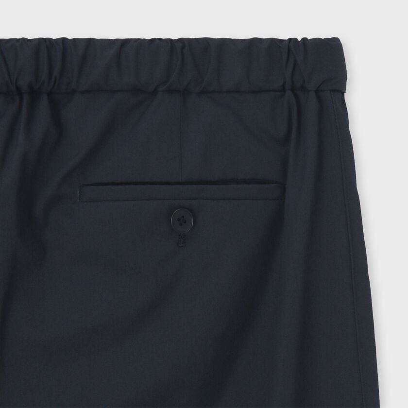 ゆったりとした太もも周りから、裾に向かって細くなるすっきりとしたシルエットのパンツです。裾にはゴムが入り絞られているため、足元がすっきりと見え、スポーティーな印象を与えます。ウエスト部分は、正面はベルト付きできちんと見えつつ、背面はゴム仕様になっているため、リラックス感とデザイン性を両立させています。後ろのポケットにはボタンが付いており、さりげないアクセントになっています。