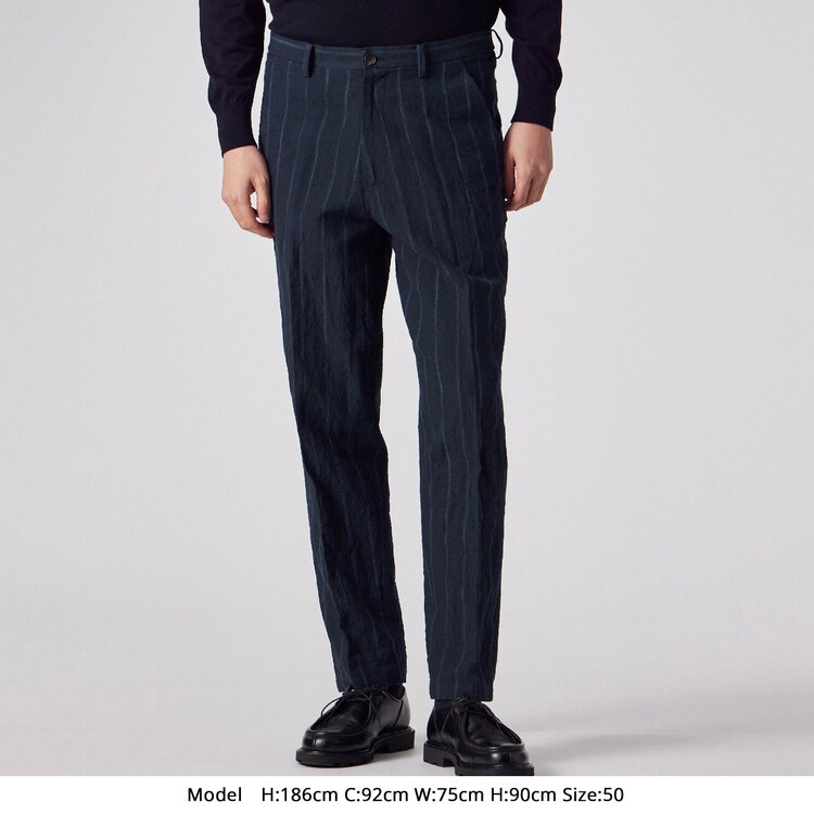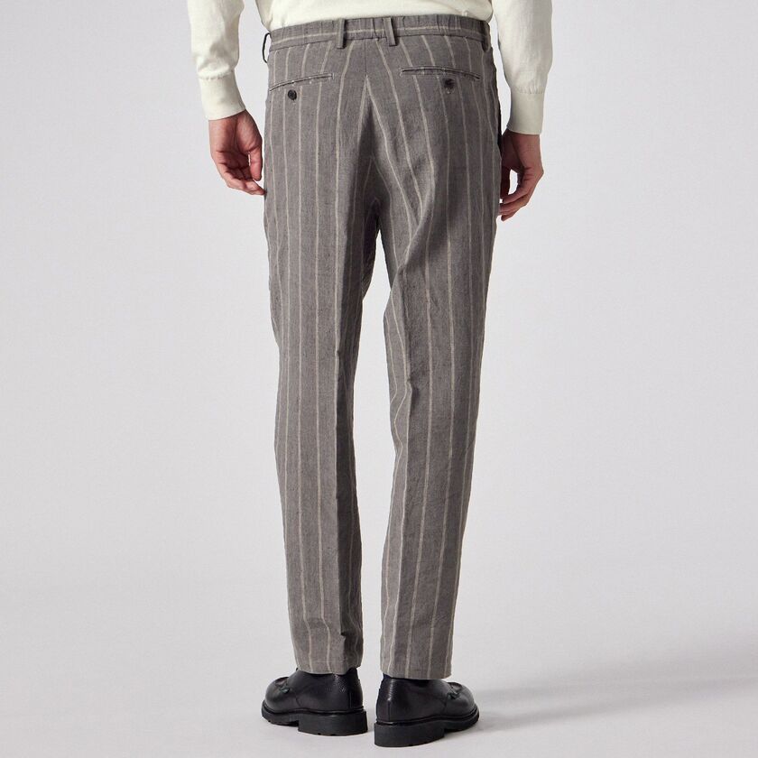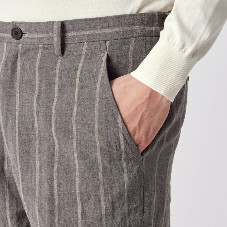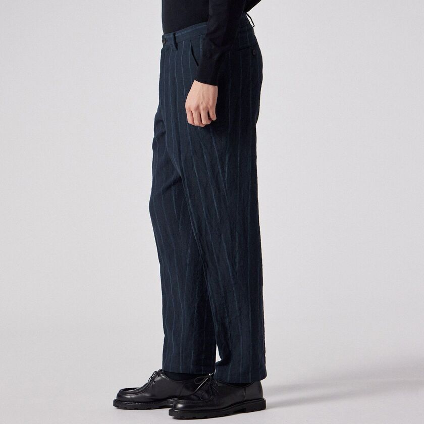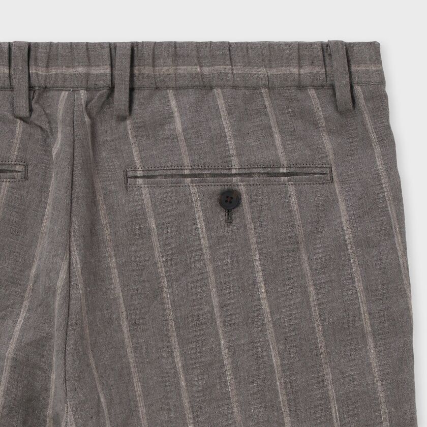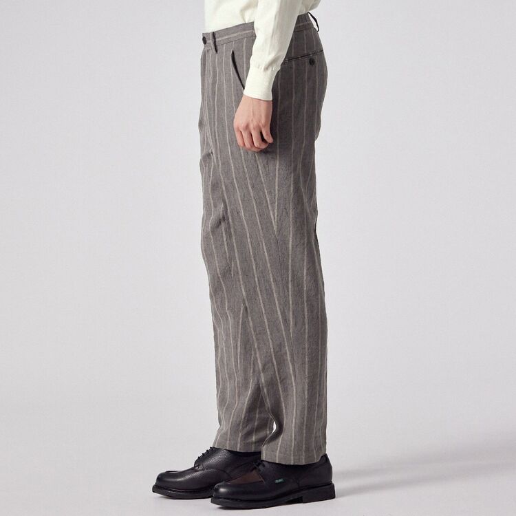 全体にあしらわれたストライプ柄が特徴のパンツです。ウエスト部分は後ろ側から両脇にかけてゴムが入った仕様になっており、ベルトを通すためのループも付いています。裾に向かって自然に細くなる、すっきりとしたシルエットに仕上げています。