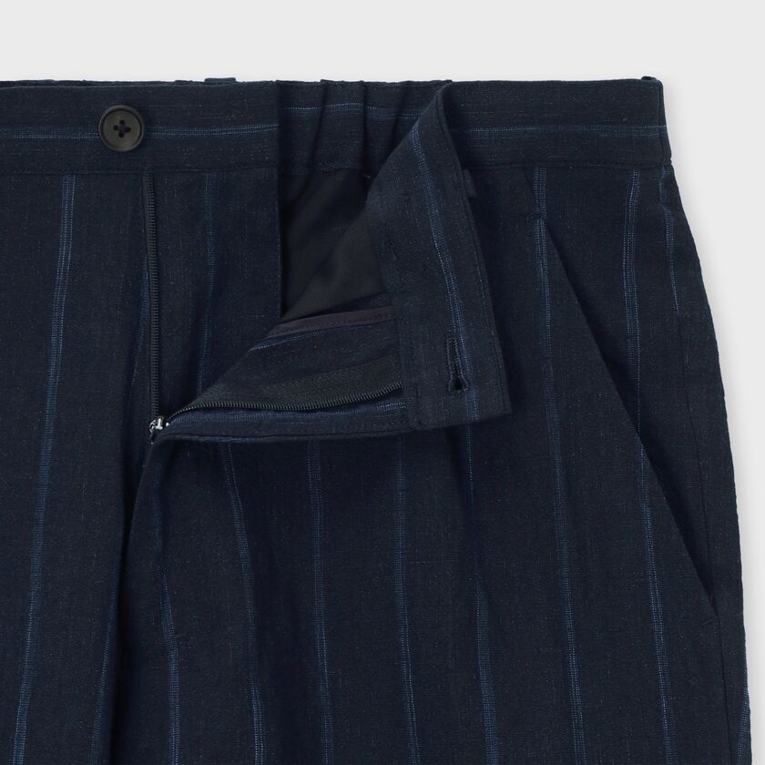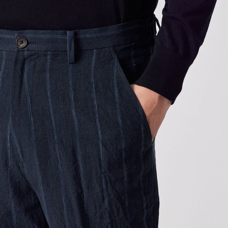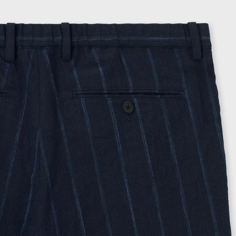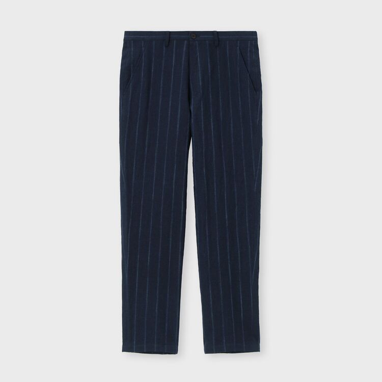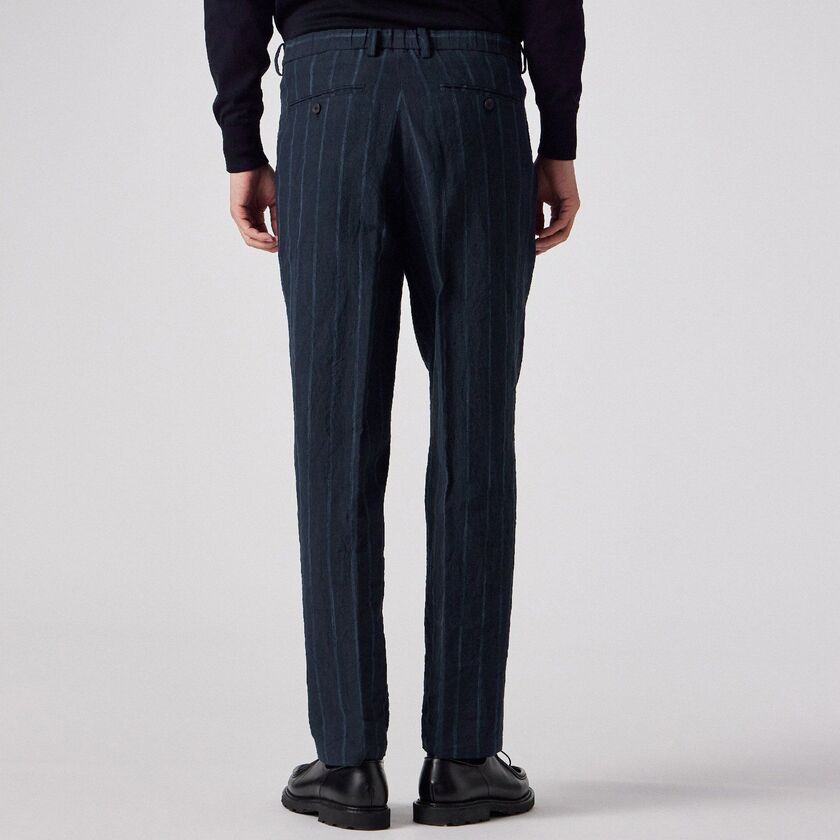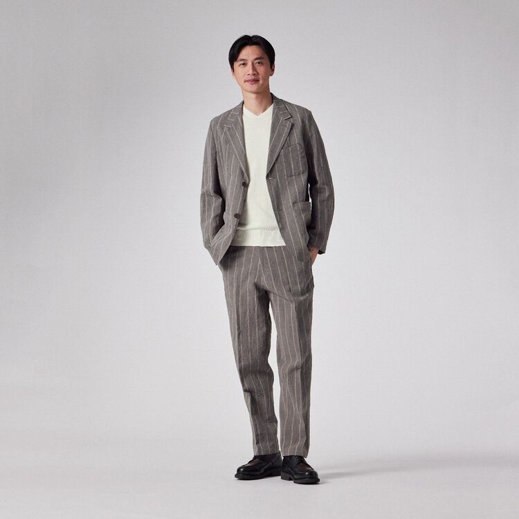 全体にあしらわれたストライプ柄が特徴のパンツです。ウエスト部分は後ろ側から両脇にかけてゴムが入った仕様になっており、ベルトを通すためのループも付いています。裾に向かって自然に細くなる、すっきりとしたシルエットに仕上げています。