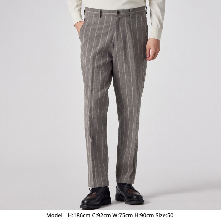 ウエストの一部がゴムになっているため、立ったり座ったりする際のお腹周りの窮屈感が少なく、楽にはいていただけます。また、リネン(麻)とコットン(綿)を組み合わせた素材により風通しが良く、さらりとした肌触りを保ちます。