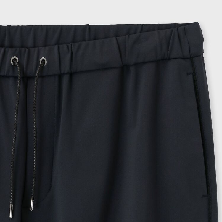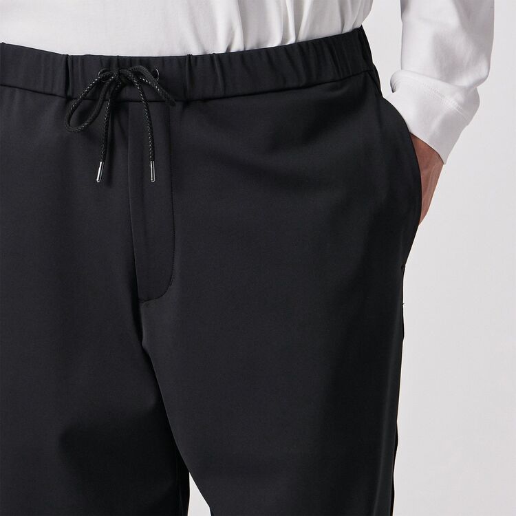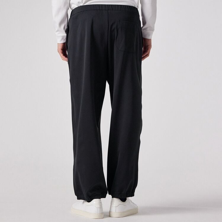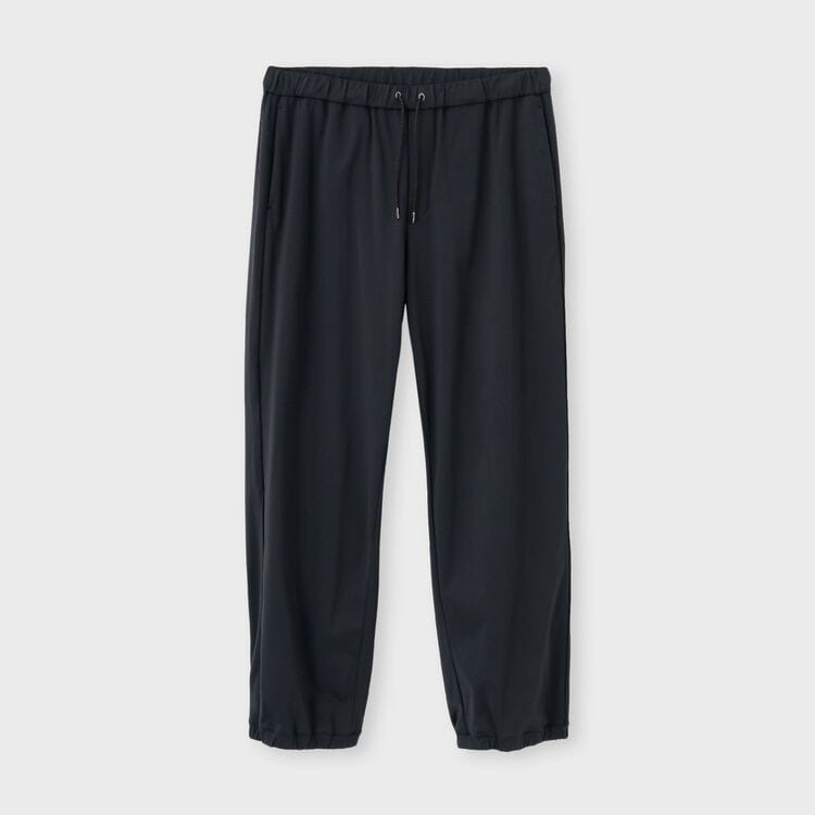 スポーティーなイージーパンツをベースに、側章部分(サイドライン)に施された光沢感のある極細パイピングがアクセントとなった一本です。ウエストと裾はゴム仕様でリラックス感がありつつ、ワタリから裾にかけて適度な丸みを持たせたシルエットが特徴です。生地特有の「落ち感」があるため、ゆったりとしていながらも野暮ったくならず、洗練されたディテールが、大人の上品さを引き立てます。