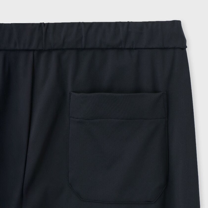 ナイロンとポリウレタンを混紡した、高密度のポンチ素材(ダブルニット)を使用しています。ハイゲージで緻密に編み上げることで、ニット素材ながらもフラットで美しい表面感を実現しました。適度な肉感とハリがあり、ジャージー素材の快適さと、布帛のような上品な質感を兼ね備えたハイブリッドな素材です。
