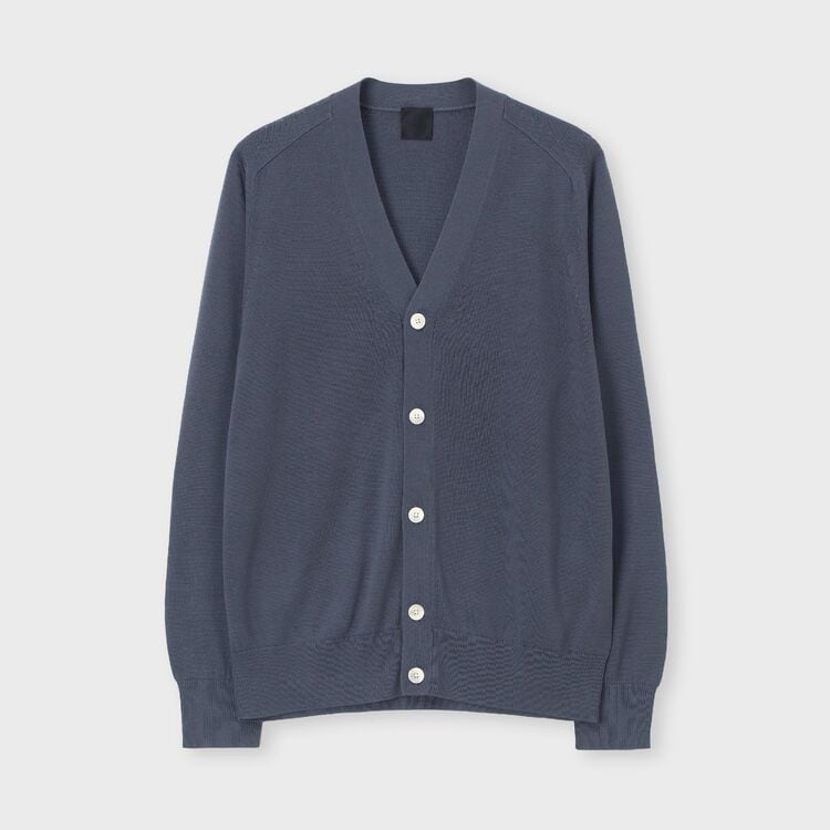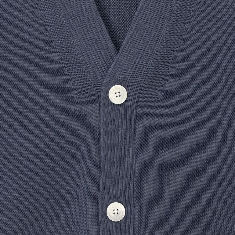 カーディガン「コネックス」は、肩から袖にかけてのデザインを工夫しており、腕や肩がとても動かしやすいのが特徴です。肩の縫い合わせ部分は編み目が細かく変化しています。これは高い技術で丁寧に編まれた証で、見た目にも高級感があります。着心地は楽なのに、だらしなく見えず、すっきりとしたきれいな形を保ってくれます。ボタンには、ブランドのロゴが入った天然の貝殻のボタンを使っています。編み目もきれいに揃っているので、シンプルですが、着ていただくととても上品で大人っぽい雰囲気に見える一着です。