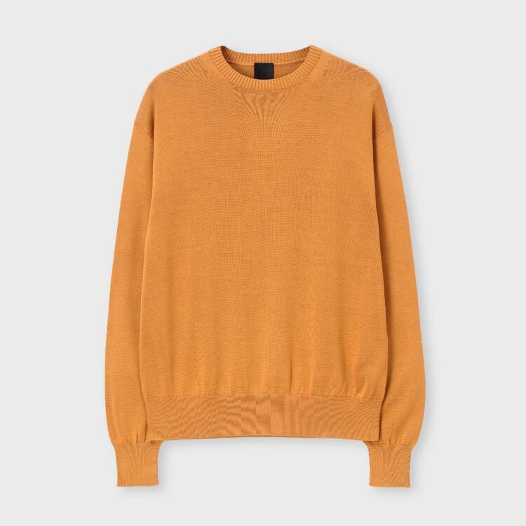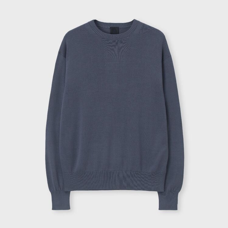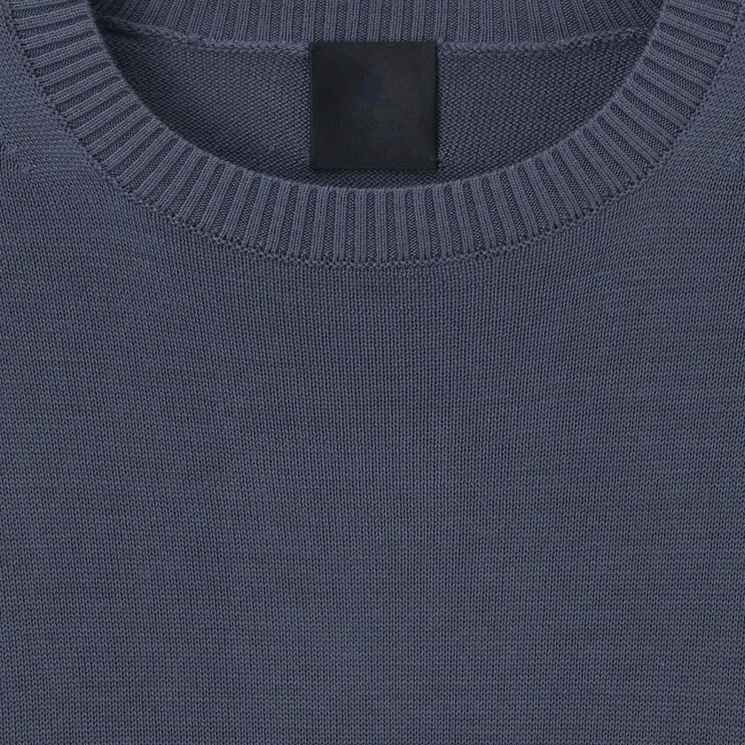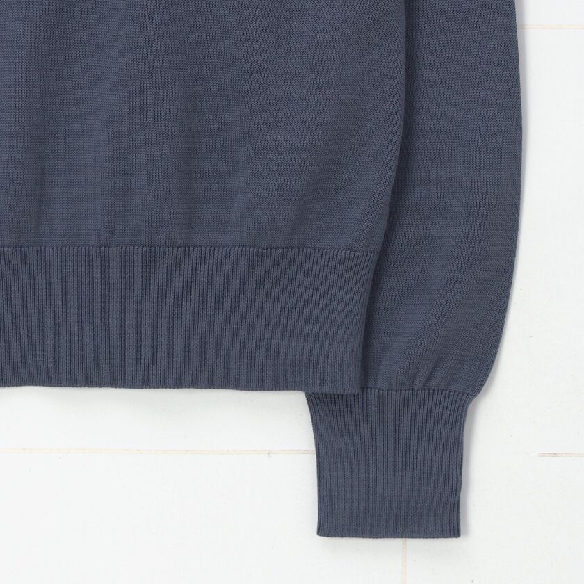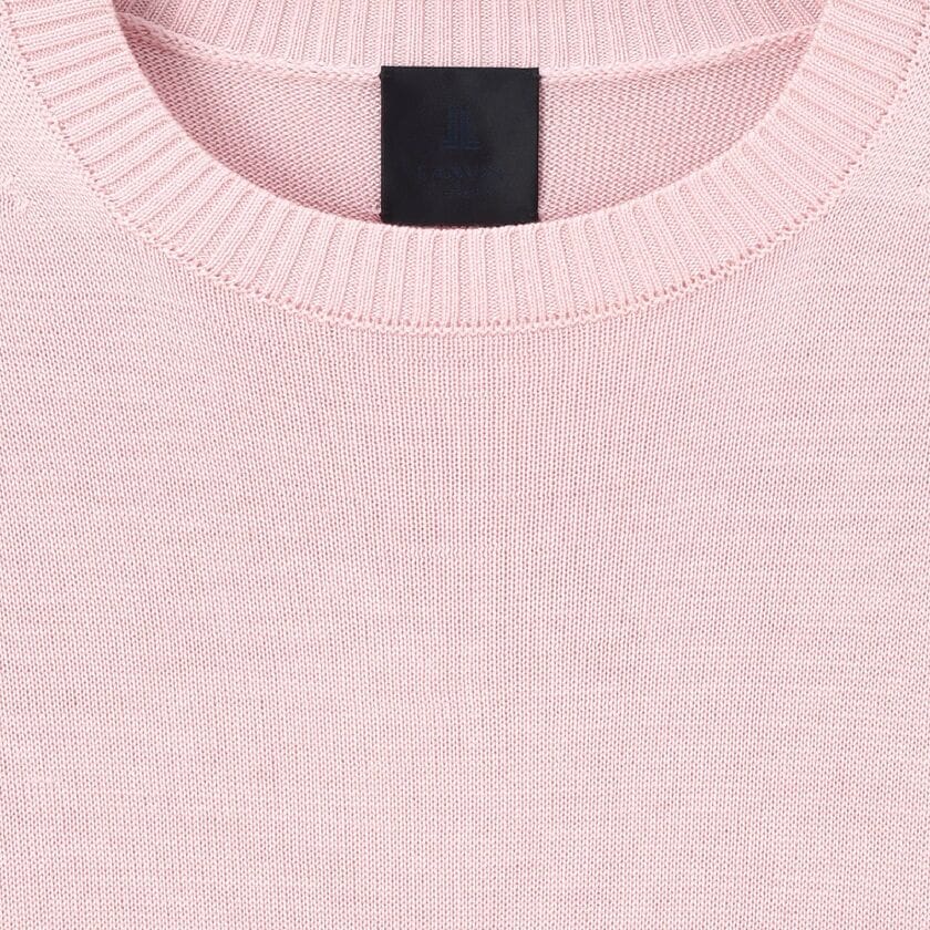 「ソマレル」は、着こなしやすいベーシックな丸首のニットです。最大の特徴は、肩から袖にかけての独自のデザインです。腕を動かしやすく、かつ着た時のシルエットがすっきりと美しく見えるように工夫されています。肩のラインに見える細かい編み目の変化は、高い技術で丁寧に作られた証で、LANVIN COLLECTION MENSならではの上質さを感じさせます。生地の表面は編み目がきれいに揃っており、滑らかな手触りと上品なツヤがあります。また、生地が柔らかく体に自然に馴染むため、動いた時もきれいな形を保ちます。シンプルなデザインだからこそ素材と仕立ての良さが引き立ち、いつもの装いに合わせるだけで、上品で洗練された印象を与えてくれます。