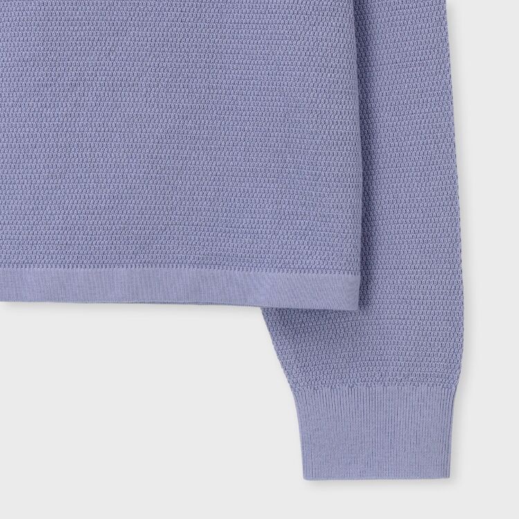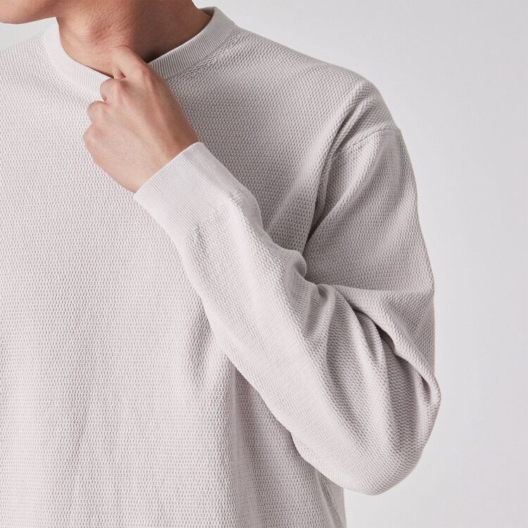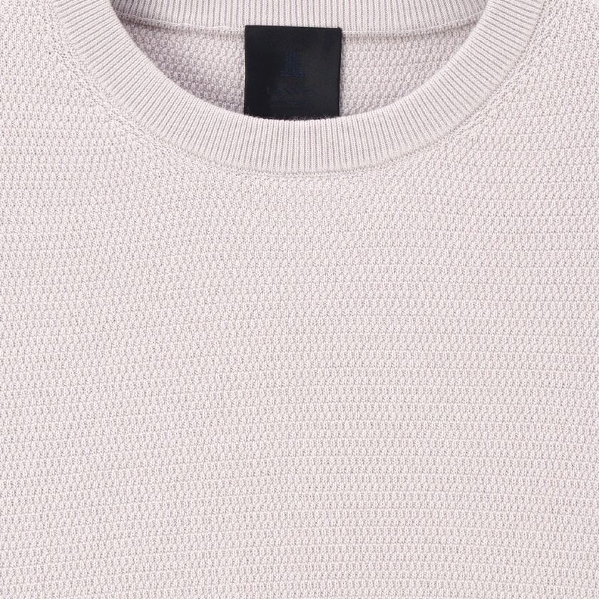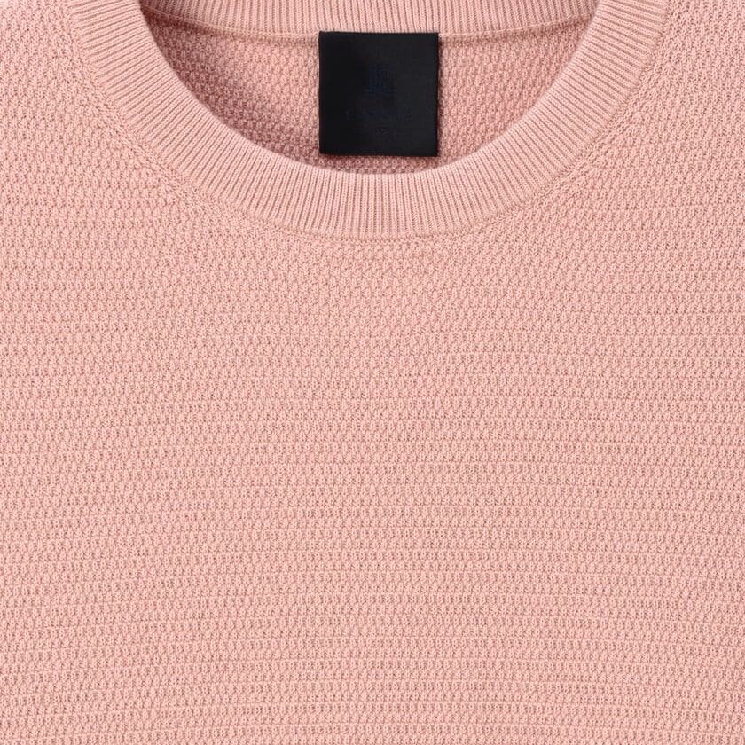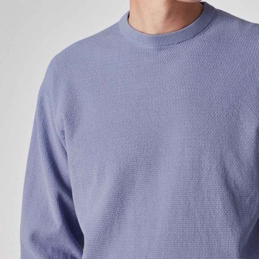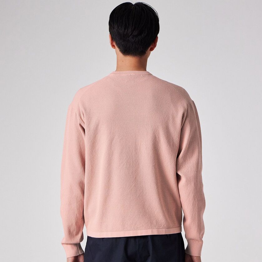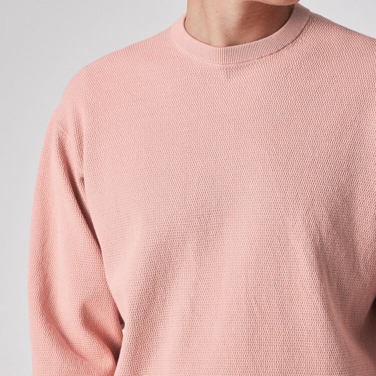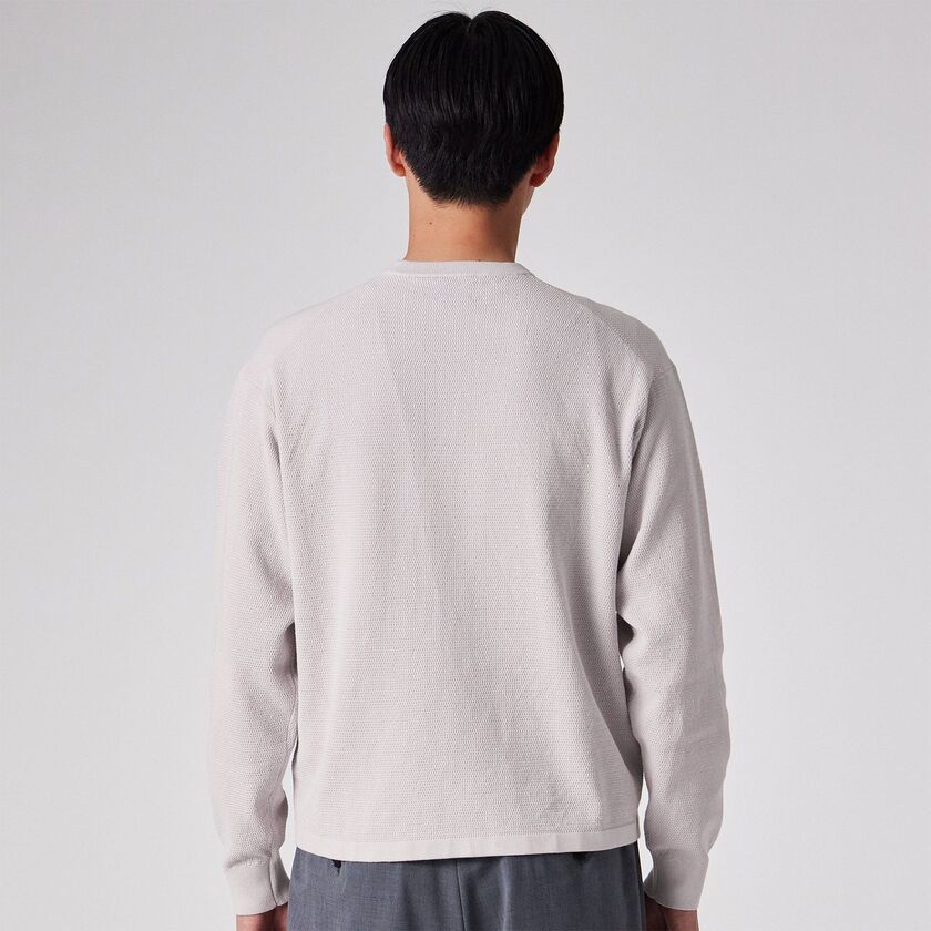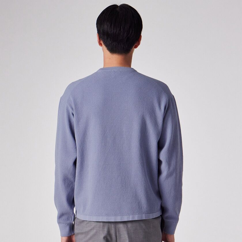 スモーキーで上品なペールトーンの色味が特徴的な、クルーネックのプルオーバーニットです。表面にはピケ編み(鹿の子編み)特有の細かな凹凸があり、無地でありながらも奥行きのある表情に仕上がっています。シンプルで洗練されたシルエットは、大人のリラックススタイルを演出します。
