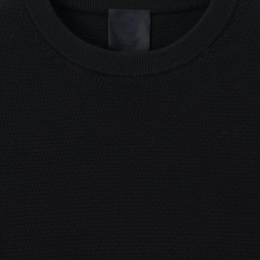 シルクのように極細でなめらかな糸を、あえて贅沢に8本も束ねて分厚く丈夫に編み上げた、こだわりのコットンニット素材です。極細の糸を多本撚りにすることで、しっかりとした素材感がありながらもしなやかさを兼ね備えています。コットンのナチュラルな風合いと、計算された撚糸技術による柔らかさが同居した最適な質感です。