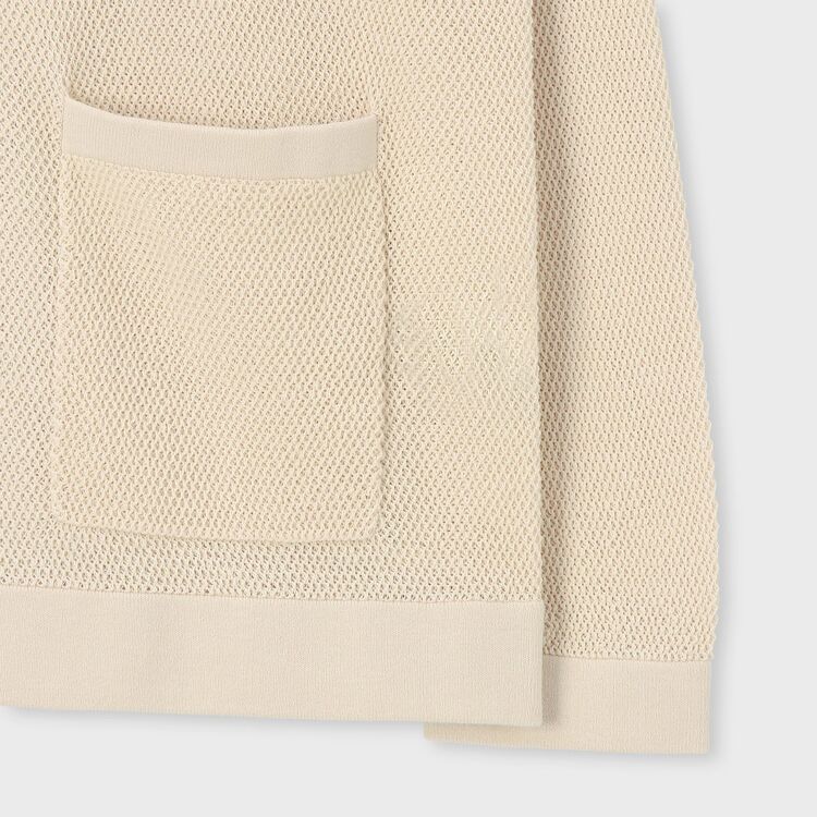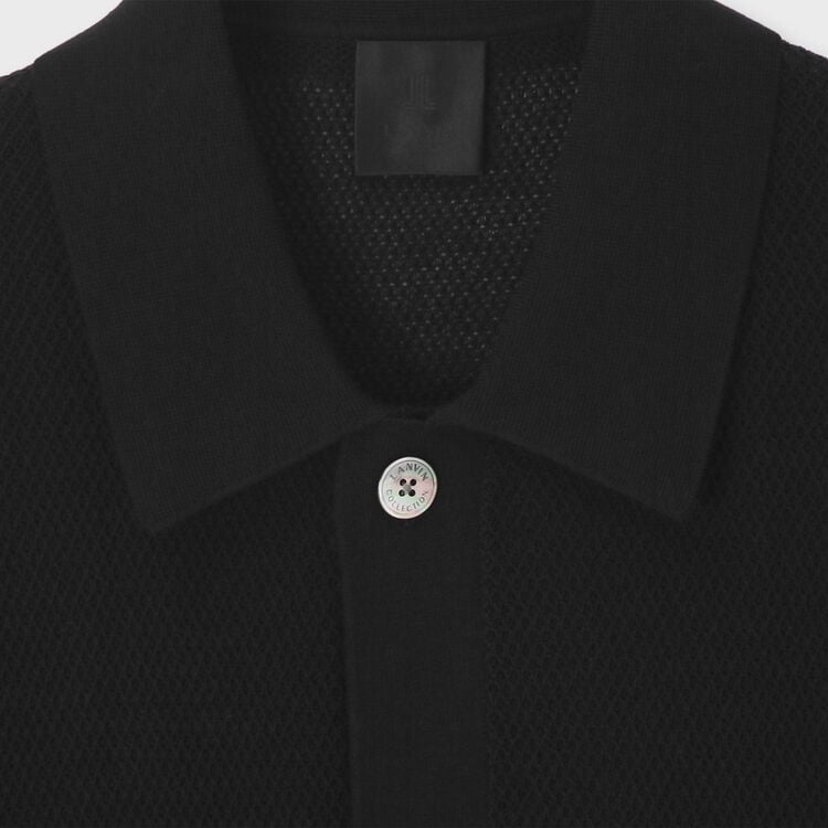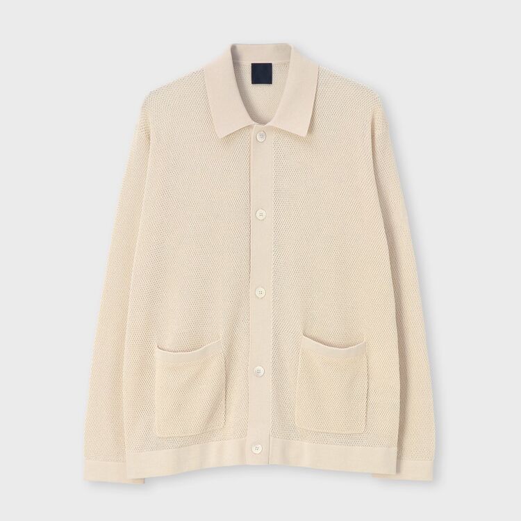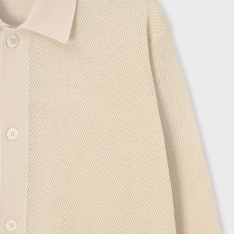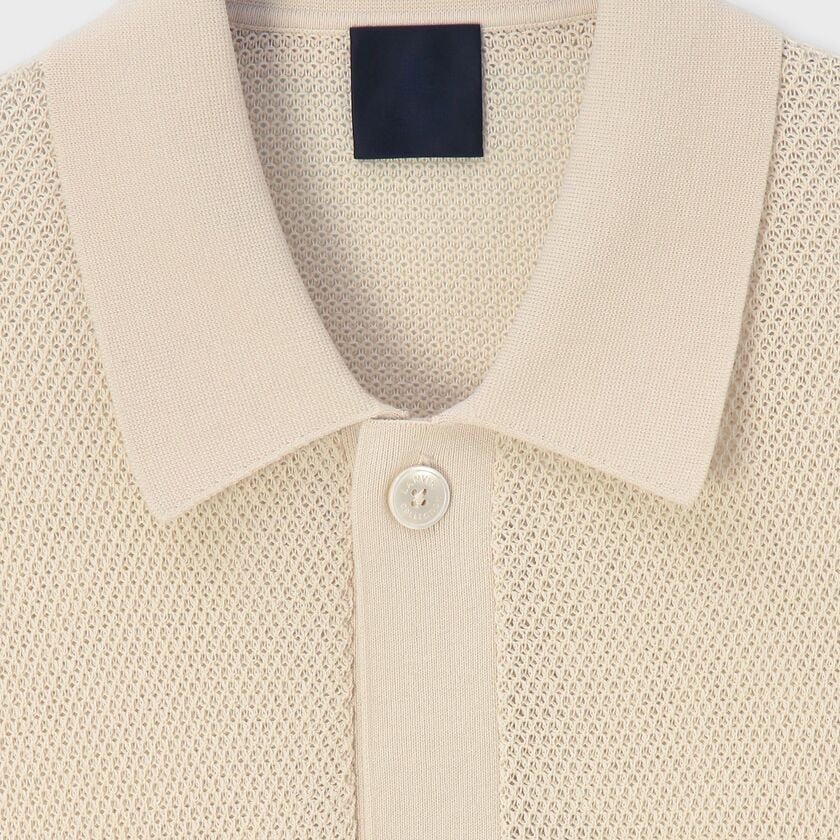 糸を強くひねることで毛羽立ちを抑え、なめらかにした綿(コットン)を使用しています。ポロシャツなどによく使われる「鹿の子(かのこ)編み」を採用し、適度なシャリ感を持たせました。フロントのボタンには天然素材ならではの美しい光沢を持つ貝(シェル)ボタンを使用しています。
