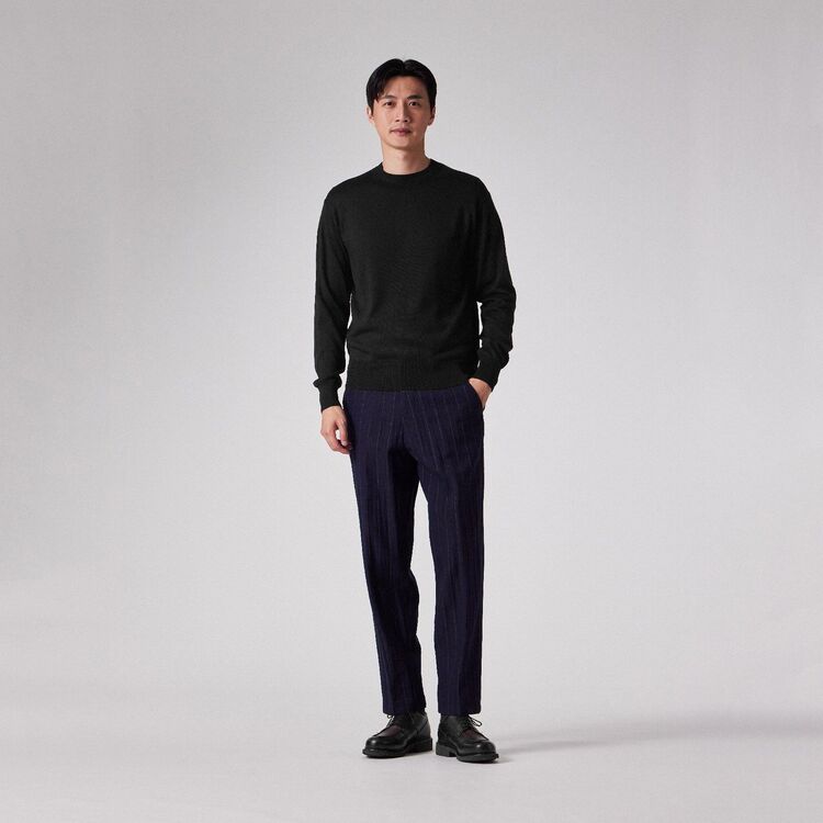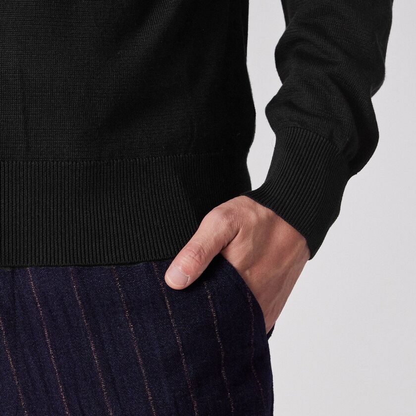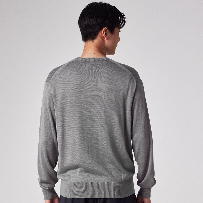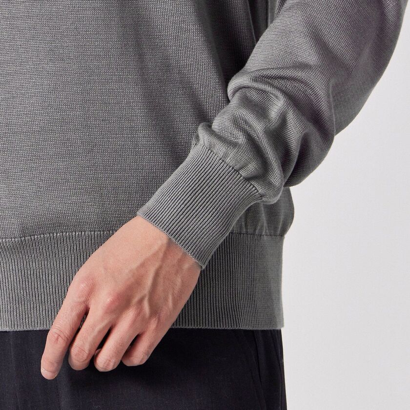 日本国内で生産された最高級のシルク100%糸を使用しています。極細の糸を3本撚り合わせるという贅沢な手法をとることで、シルクならではの繊細なタッチを残しつつ、ふっくらとした豊かな風合いを最大限に引き出しました。素材の良さを存分に堪能できる、贅沢なミドルゲージニットです。