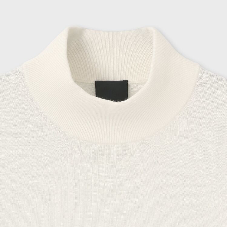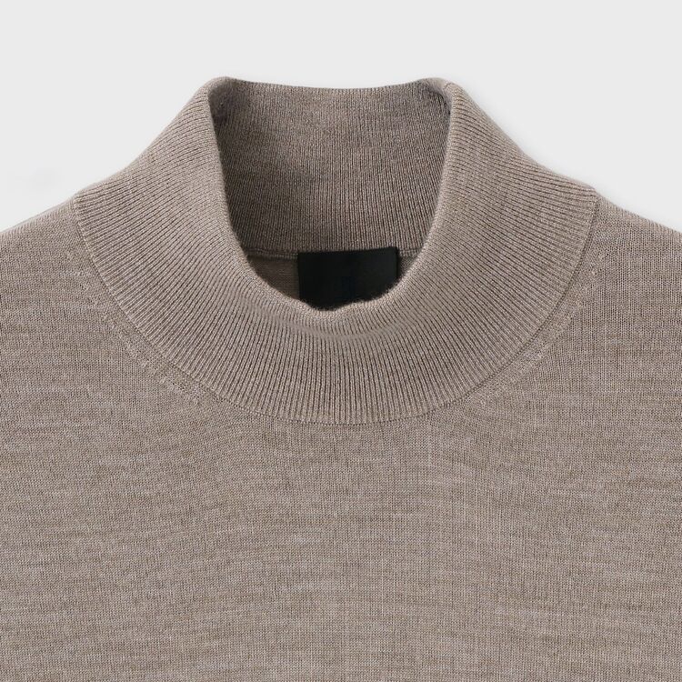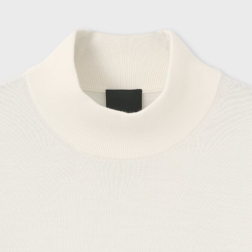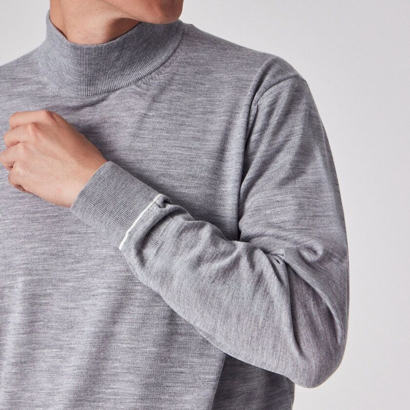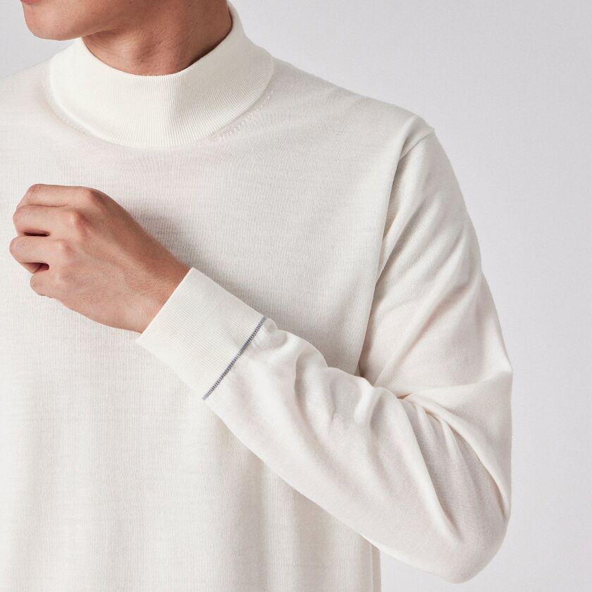 ソフトで繊細な糸を丁寧にハイゲージで編み上げているため、生地の厚みが抑えられており、すっきりとした着用感を実現しています。首周りの窮屈さもなく、ジャケットの中に着ても着膨れしません。動きやすさとシルエットの美しさを両立し、一日中快適にお過ごしいただけます。