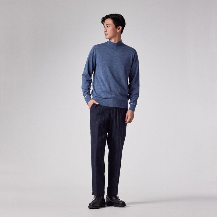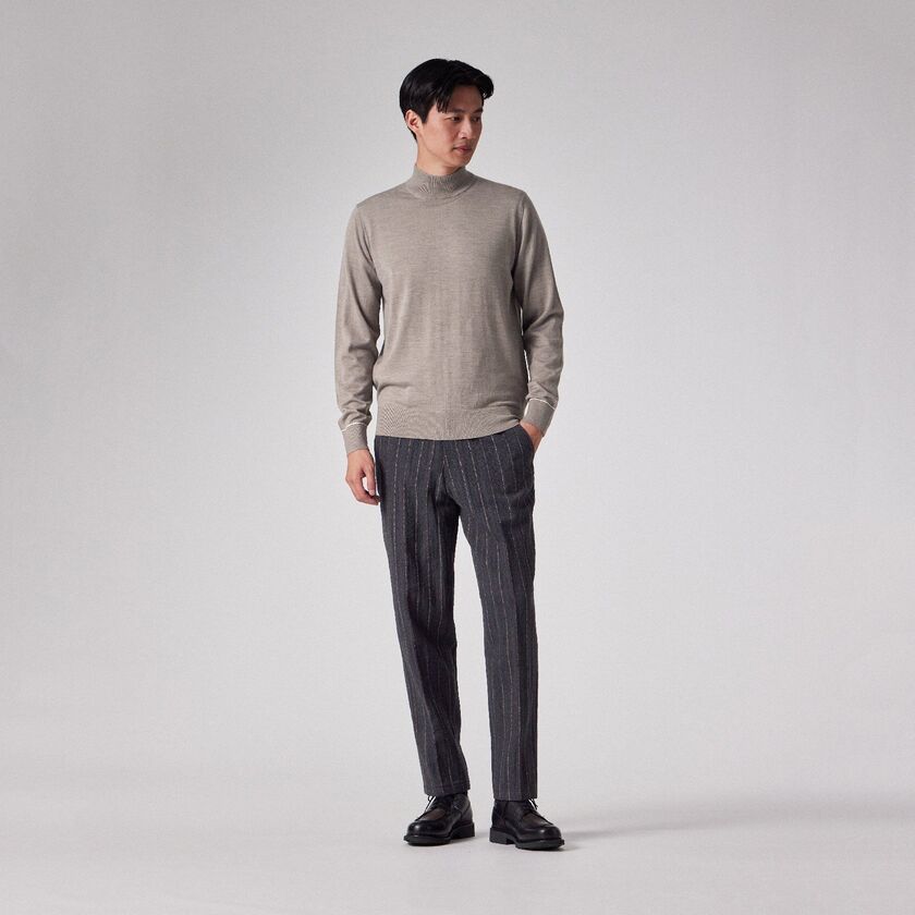 イタリアの名門紡績メーカー「Botto Giuseppe(ボット・ジュゼッペ)社」のSuperfine 130's Merino Woolを使用しています。環境や動物愛護に配慮したサステナブルな背景を持ちながら、風合いや着心地には一切の妥協を許さないハイクオリティな素材。非常に細い繊維が生み出す、ソフトで滑らかな極上の肌触りです。