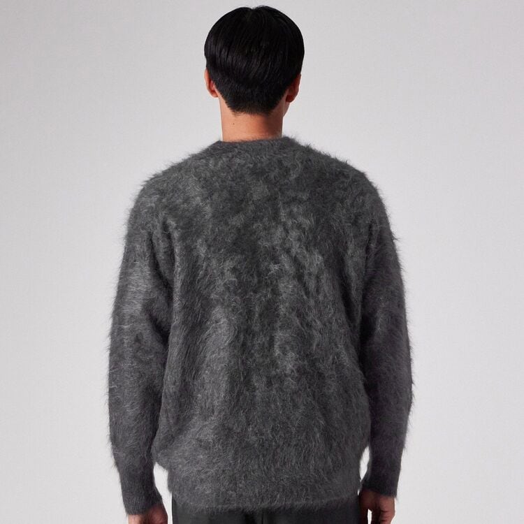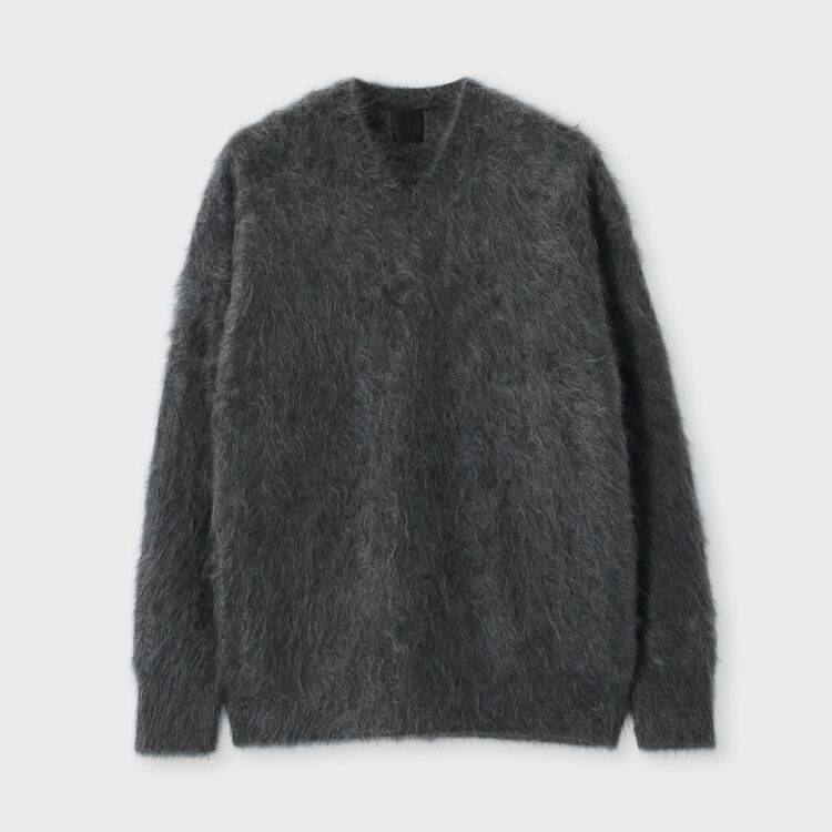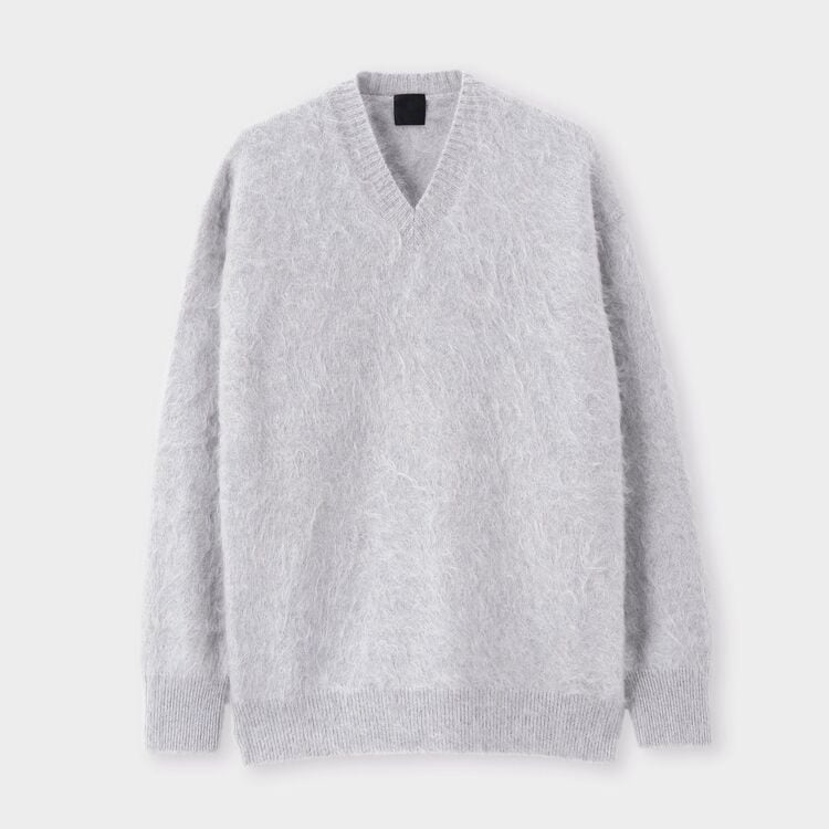 素材そのものに強い存在感と華やかさがあるため、シンプルなスラックスやデニムと合わせるだけでコーディネートが完成します。カットソーの上に一枚で着てリラックスした休日を楽しむのはもちろん、シャツとレイヤードして少し背筋を伸ばしたディナーやデートシーンにも最適。秋冬の装いを一気にラグジュアリーなムードへと引き上げてくれる主役級ニットです。