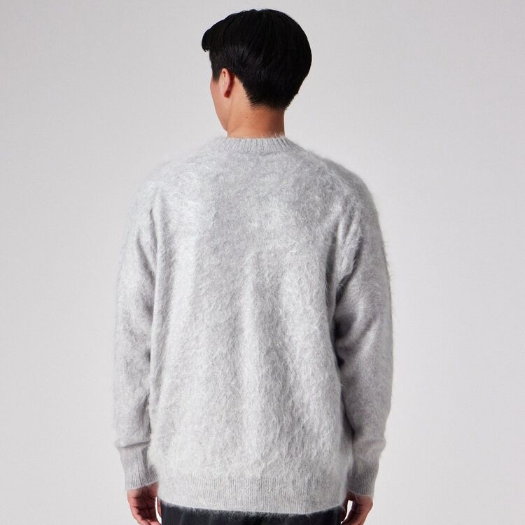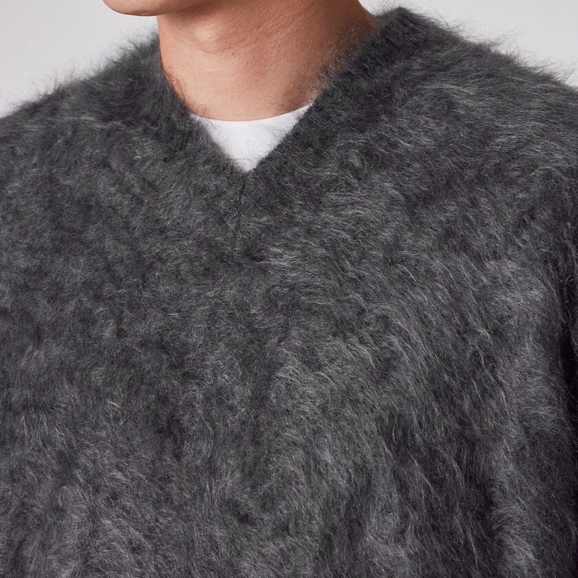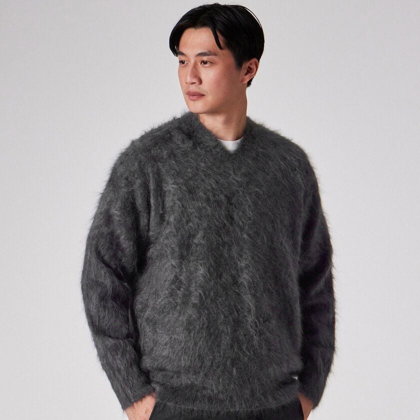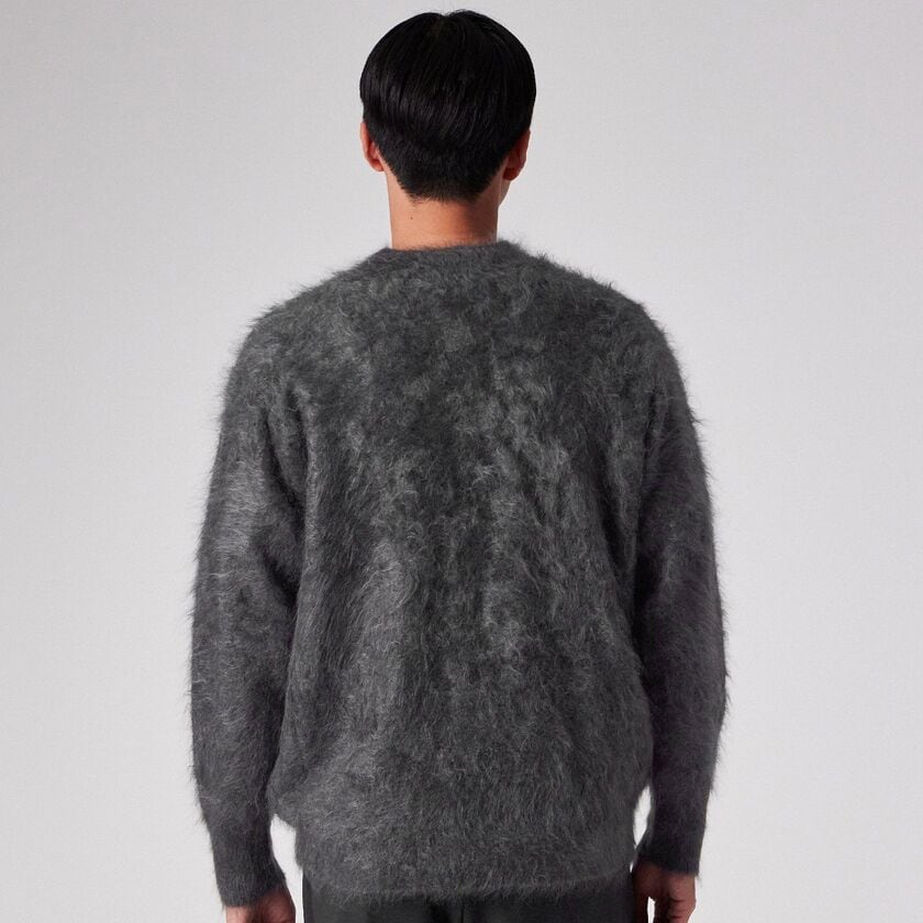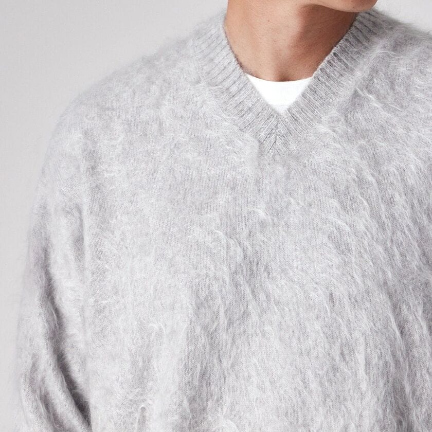 日本国内で紡績された最高級のカシミヤ100%糸を使用しています。最大の特徴は、ブラシ等の針で表面をひっかいて毛羽立たせる一般的な「起毛」ではなく、編み地を揉み込む際の温度と時間を職人の長年の勘でコントロールし、毛を吹かせる「ファー加工」を採用している点です。繊維を傷つけずに自然に毛を立たせているため、まるで本物の毛皮のような「密度」と「弾力」、そして人工的には作れない自然な「ふわふわ感」を実現しました。