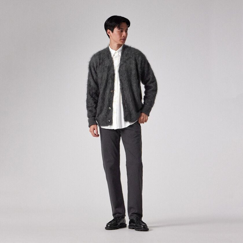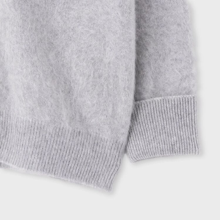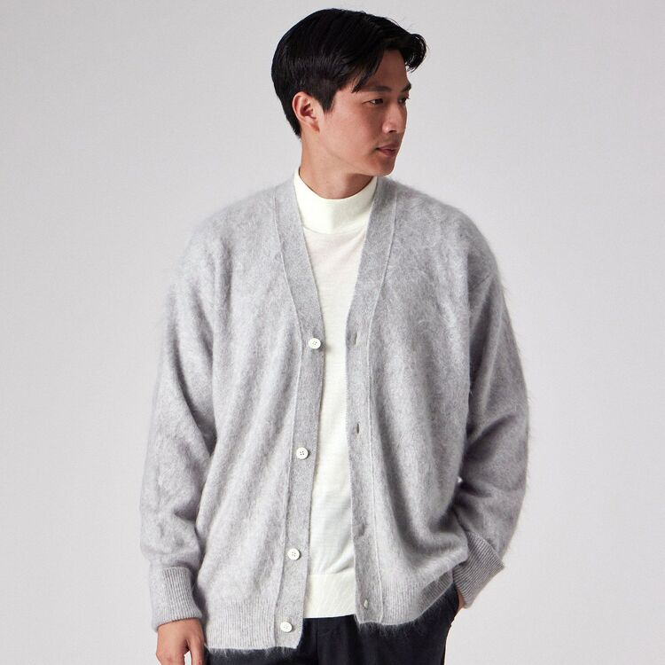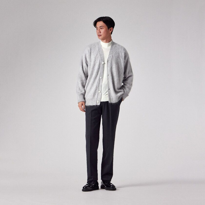 カシミヤの繊維を傷つけずに密度を高める特別な加工により、毛足の間にたっぷりと空気を含みます。その保温性は非常に高く、秋口や春先には「アウター代わり」として十分機能するほどの暖かさを誇ります。一般的な起毛ニットと比べて繊維の脱落が少なく、また素肌に触れても驚くほど滑らか。見た目はボリューミーですが、着用感は非常に軽く、長時間着ていても肩が凝りません。