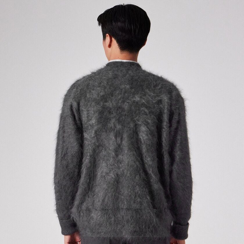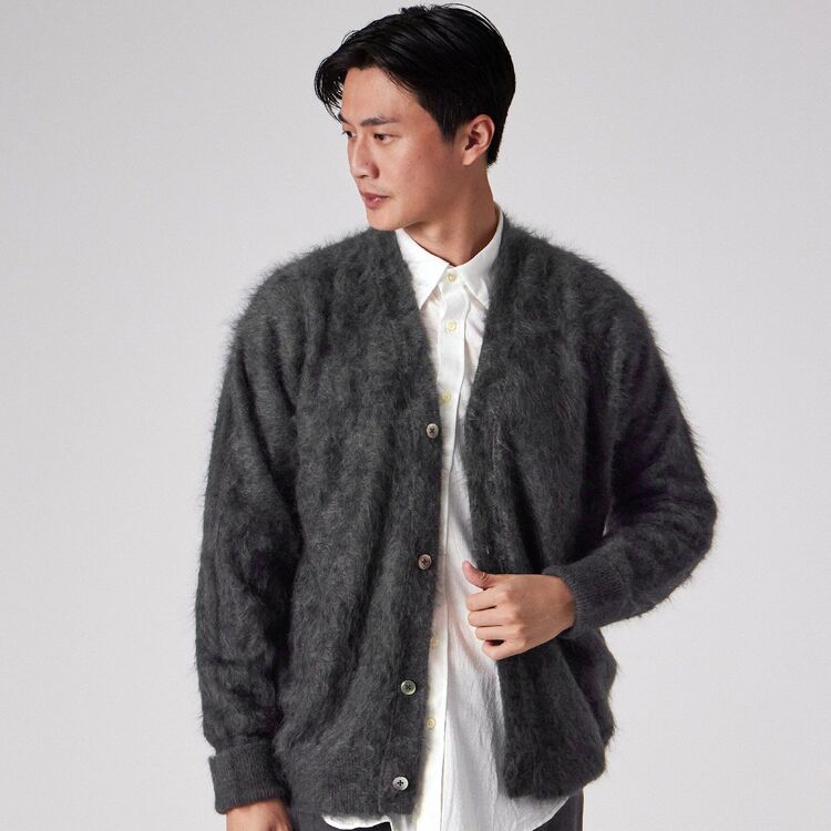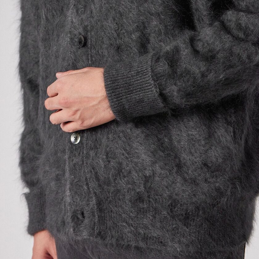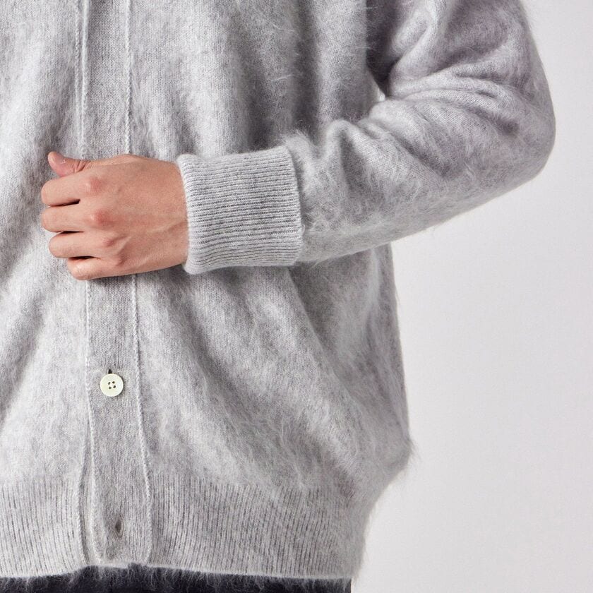 日本国内で生産された最高級のカシミヤ100%糸を使用しています。最大の特徴は、金属ブラシで無理やり掻き出す一般的な「起毛」ではなく、職人が温度と時間を緻密に管理しながら編み地を揉み込む「縮絨(しゅくじゅう)」によって毛を吹かせる「ファー加工」です。繊維一本一本が自然な状態で立ち上がっているため、まるで本物の毛皮のような滑らかな手触りと、人工的には作り出せない奥深い“ふわふわ”感を堪能していただけます。