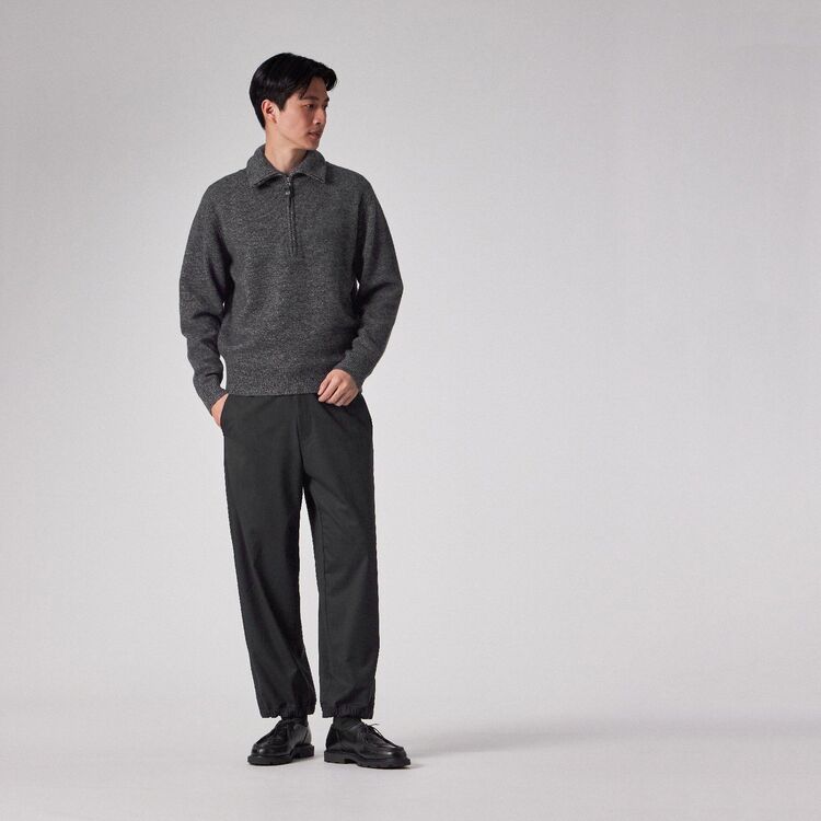 【CONTRAS/コントラ】は、アメカジの王道アイテムであるハーフジッププルオーバーを、LANVIN COLLECTION MENSのフィルターを通して大人のエレガンスへと昇華させた一着です。スポーティなディテールを残しつつ、無駄を削ぎ落としたミニマルなフォルムと、ジップの引き手に配されたシックな異素材アクセントが高級感を漂わせます。襟を立ててシャープに見せたり、ジップを開けてインナーを覗かせたりと、首元のニュアンスを変えるだけで多彩な表情を楽しめます。