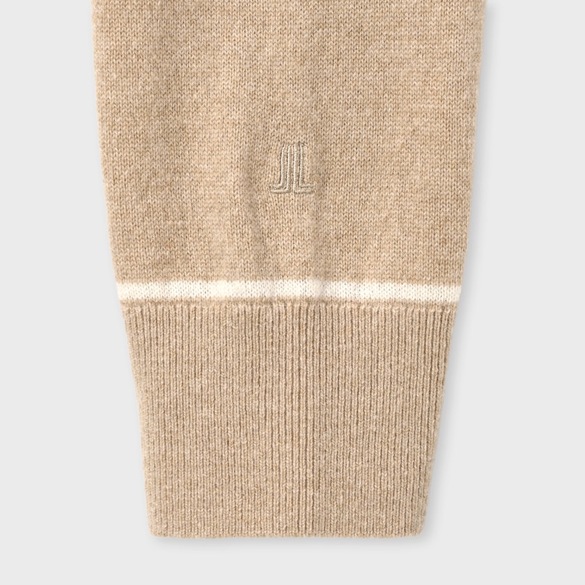 ベーシックなクルーネックをベースに、大人の遊び心を効かせた洗練されたルックスです。襟のリブ先端と袖リブの上部に繊細な配色ラインを施すことで、まるでインナーに白いTシャツを重ね着(レイヤード)しているかのような「トロンプルイユ(だまし絵)」効果を演出。左袖口にはさりげなく「WJL」の刺繍があしらわれており、シンプルながらも細部にこだわりを感じさせる仕上がりです。